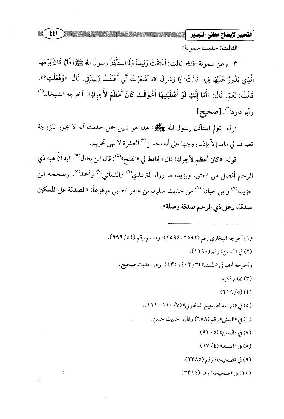 3 - وعن ميمونة - رضي الله عنها - قالت: أَعْتَقَتْ وَليدَةً وَلَمْ أسْتَأْذِنَ رسولَ الله - صلى الله عليه وسلم -، فَلمَّا كَانَ يَوْمُهَا الَّذِي يَدُورُ عَلَيْهَا فِيهِ. قَالَتْ: يَا رَسُولَ الله أشَعَرْتَ أَنِّي أَعْتَقْتُ وَلِيدَتِي. قَالَ: "وَفَعَلْتِ؟ ". قَالَتْ: نَعَمْ. قَالَ: "أَمَا إِنَّكِ لَوْ أَعْطَيْتِيهَا أَخْوَالَكِ كَانَ أَعْظَمَ لأَجْرِكِ". أخرجه الشيخان (¬1) وأبو داود (¬2). [صحيح]