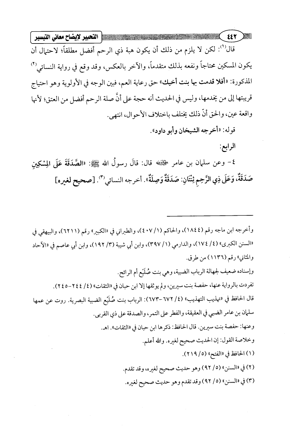 4 - وعن سلمان بن عامر - رضي الله عنه - قال: قَالَ رسولُ الله - صلى الله عليه وسلم -: "الصَّدَقَةَ عَلَى المِسْكِينِ صَدَقَةٌ، وَعَلَى ذِي الرَّحِمِ ثِنْتَانِ: صَدَقَةٌ وَصِلَةٌ". أخرجه النسائي (¬3). [صحيح لغيره]