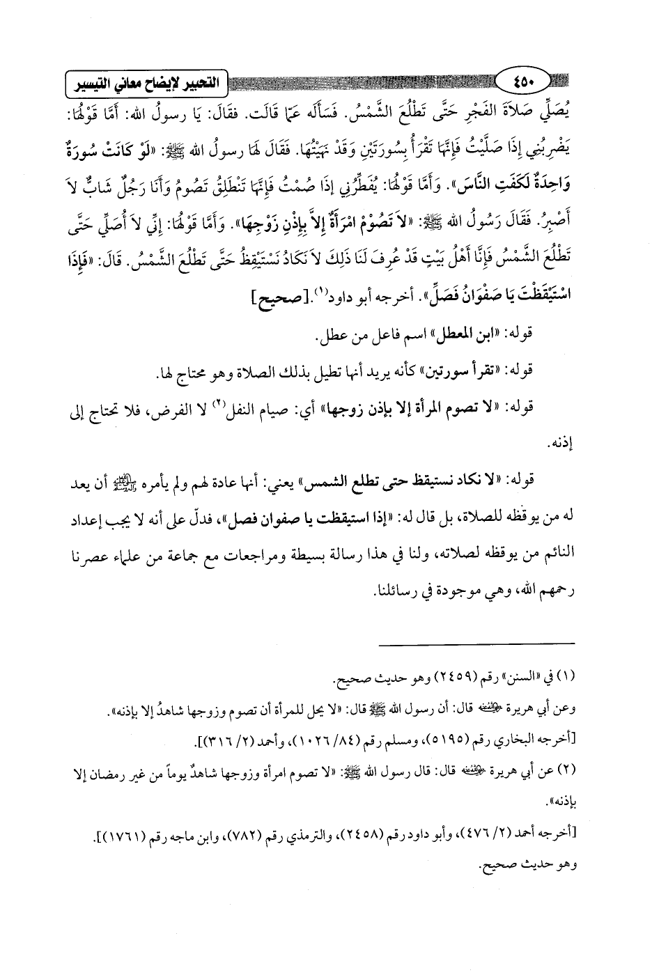 يُصَلِّي صَلاَةَ الفَجْرِ حَتَّى تَطْلُعَ الشَّمْسُ. فَسَأَلَه عَمّا قَالَت. فقَالَ: يَا رسولُ الله: أَمَّا قَوْلُهَا: يَضْرِبُنِي إِذَا صَلَّيْتُ فَإِنَّهَا تَقْرَأُ بِسُورَتَيْنِ وَقَدْ نَهَيْتُهَا. فَقَالَ لَهَا رسولُ الله - صلى الله عليه وسلم -: "لَوْ كَانَتْ سُورَةٌ وَاحِدَةٌ لكَفَتِ النَّاسَ". وَأَمَّا قَوْلُهَا: يُفَطِّرُنِي إذَا صُمْتُ فَإِنَّهَا تَنْطَلِقُ تَصُومُ وَأَنَا رَجُلٌ شَابٌّ لاَ أَصْبِرُ. فَقَالَ رَسُولُ الله - صلى الله عليه وسلم -: "لاَ تَصُوْمْ امْرَأَةٌ إِلاَّ بِإِذْنِ زَوْجِهَا". وَأَمَّا قَوْلُهَا: إِنِّي لاَ أُصَلِّي حَتَّى تَطْلُعَ الشَّمْسُ فَإِنَّا أَهْلُ بَيْتٍ قَدْ عُرِفَ لَنَا ذَلِكَ لاَ نَكَادُ نَسْتَيْقِظُ حَتَّى تَطْلُعَ الشَّمْسُ. قَالَ: "فَإِذَا اسْتَيْقَظْتَ يَا صَفْوَانُ فَصَلِّ". أخرجه أبو داود (¬1). [صحيح]