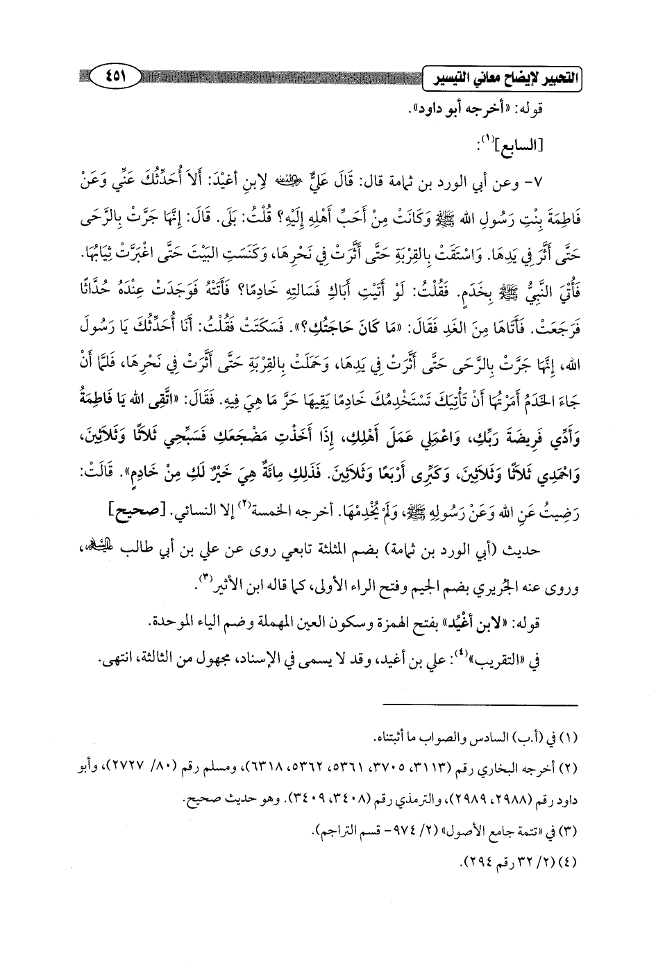 7 - وعن أبي الورد بن ثمامة قال: قَالَ عَليٌّ - رضي الله عنه - لِابنِ أغيْدَ: أَلاَ أُحَدِّثُكَ عَنِّي وَعَنْ فَاطِمَةَ بِنْتِ رَسُولِ الله - صلى الله عليه وسلم - وَكَانَتْ مِنْ أَحَبِّ أَهْلِهِ إِلَيْهِ؟ قُلْتُ: بَلَى. قَالَ: إِنَّهَا جَرَّتْ بِالرَّحَى حَتَّى أَثَّرَ فِي يَدِهَا. وَاسْتَقَتْ بِالقِرْبَةِ حَتَّى أَثَّرَتْ فِي نَحْرِهَا، وَكَنَسَتِ البَيْتَ حَتَّى اغْبَرَّتْ ثِيَابُهَا. فَأُتْيَ النَّبِيُّ - صلى الله عليه وسلم - بِخَدَمٍ. فَقُلْتُ: لَوْ أَتَيْتِ أَبَاكِ فَسَألتِهِ خَادِمًا؟ فَأَتَتْهُ فَوَجَدَتْ عِنْدَهُ حُدَّاثًا فَرَجَعَتْ. فَأَتَاهَا مِنَ الغَدِ فَقَالَ: "مَا كَانَ حَاجَتُكِ؟ ". فَسَكَتَتْ فَقُلْتُ: أَنَا أُحَدِّثُكَ يَا رَسُولَ الله، إِنَّهَا جَرَّتْ بِالرَّحَى حَتَّى أَثَّرَتْ فِي يَدِهَا، وَحَمَلَتْ بِالقِرْبَةِ حَتَّى أَثَّرَتْ فِي نَحْرِهَا، فَلمَّا أَنْ جَاءَ الخَدَمُ أَمَرْتُهَا أَنْ تَأْتِيَكَ تَسْتَخْدِمُكَ خَادِمًا يَقِيهَا حَرَّ مَا هِيَ فِيهِ. فَقَالَ: "اتَّقِي الله يَا فَاطِمَةُ وَأَدَّي فَرِيضَةَ رَبِّكِ، وَاعْمِلي عَمَلَ أَهْلِكِ، إِذَا أَخَذْتِ مَضْجَعَكِ فَسَبِّحِي ثَلاَثًا وَثَلاَثِينَ، وَاحْمَدِي ثَلاَثًا وَثَلاَثِينَ، وَكَبِّرِي أَرْبَعًا وَثَلاَثِينَ. فَذَلِكِ مِائَةٌ هِيَ خَيْرٌ لَكِ مِنْ خَادِمٍ". قَالَتْ: رَضِيتُ عَنِ الله وَعَنْ رَسُولِهِ - صلى الله عليه وسلم -، وَلَمْ يُخْدِمْهَا. أخرجه الخمسة (¬2) إلا النسائي. [صحيح]