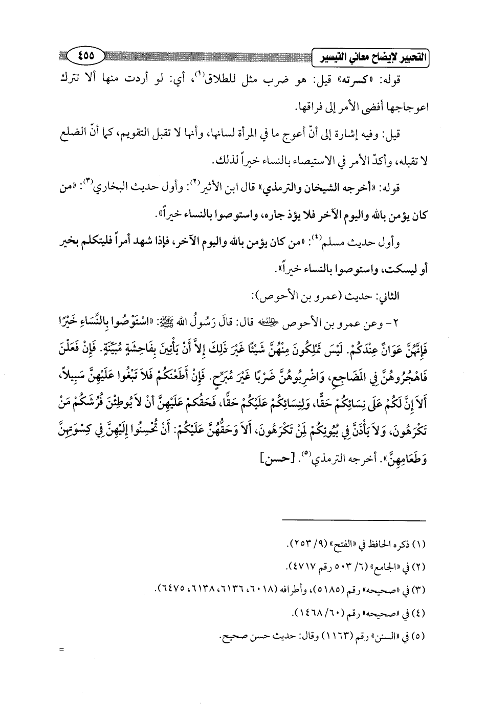 2 - وعن عمرو بن الأحوص - رضي الله عنه - قال: قَالَ رَسُولُ الله - صلى الله عليه وسلم -: "اسْتَوْصُوا بِالنِّسَاءِ خَيْرًا فَإِنَّهُنَّ عَوَانٌ عِنْدَكُمْ. لَيْسَ تَمْلِكُونَ مِنْهُنَّ شَيْئًا غَيْرَ ذَلِكَ إِلاَّ أَنْ يَأْتِينَ بِفَاحِشَةٍ مُبَيِّنَةٍ. فَإِنْ فَعَلْنَ فَاهْجُرُوهُنَّ فِي المَضَاجِعِ، وَاضْرِبُوهُنَّ ضَرْبًا غَيْرَ مُبرِّحٍ. فَإِنْ أَطَعْنَكُمْ فَلاَ تَبْغُوا عَلَيْهِنَّ سَبِيلًا، أَلاَ إِنَّ لَكُمْ عَلَى نِسَائِكُمْ حَقًّا، وَلنِسَائِكُمْ عَلَيْكُمْ حَقًّا، فَحَقُكمْ عَلَيْهِنَّ أنْ لاَ يُوطِئْنَ فُرُشَكُمْ مَنْ تَكْرَهُونَ، وَلاَ يَأْذَنَّ فِي بُيُوتِكُمْ لِمَنْ تَكْرَهُونَ، أَلاَ وَحَقُّهُنَّ عَلَيْكُمْ: أَنْ تُحْسِنُوا إِلَيْهِنَّ فِي كِسْوَتِهِنَّ وَطَعَامِهِنَّ". أخرجه الترمذي (¬5). [حسن]