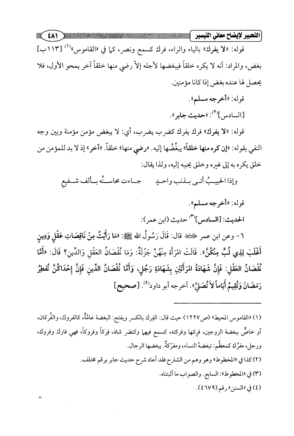 (¬1) "القاموس المحيط" (ص 1227) حيث قال: الفِرك بالكسر ويفتح: البغضة عامَّةٌ, كالفروك، والفُركان، أو خاصٌّ ببغضة الزوجين، فرِكها وفركته، كسمع فيهما وكنصَر شاذ، فِركاً وفروكاً، فهي فارك وفروك، ورجل، مفرَّك كمعظَّم: تبغضهُ النساء، ومفرّكةٌ. يبغضها الرجال.