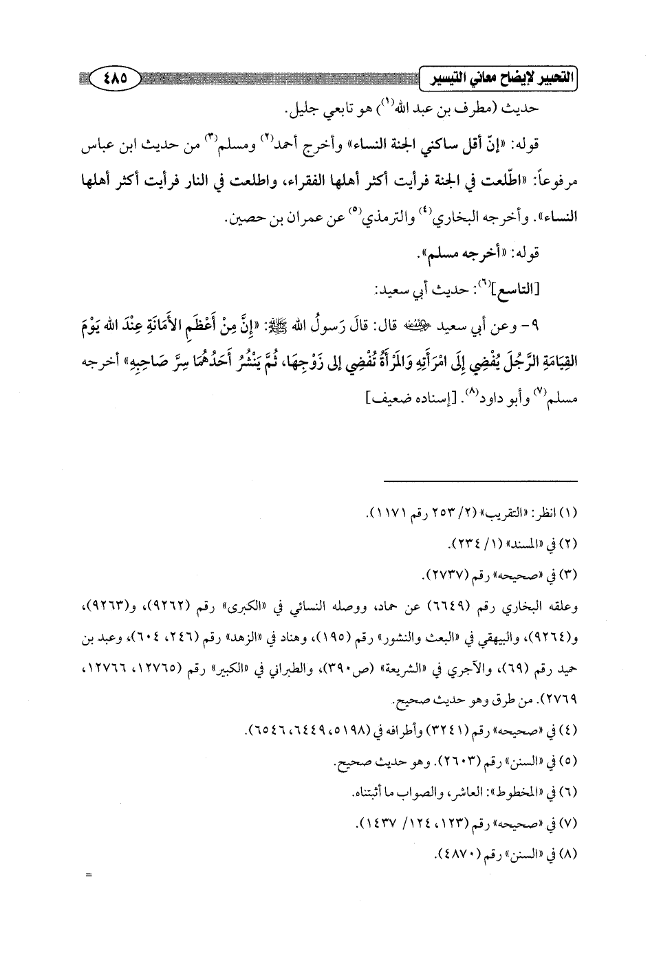 9 - وعن أبي سعيد - رضي الله عنه - قال: قَالَ رَسولُ الله - صلى الله عليه وسلم -: "إِنَّ مِنْ أَعْظَمِ الأَمَانَةِ عِنْدَ الله يَوْمَ القِيَامَةِ الرَّجُلَ يُفْضِي إِلَى امْرَأَتِهِ وَالمَرْأَةُ تُفْضِي إلى زَوْجِهَا، ثُمَّ يَنْشُرُ أَحَدُهُمَا سِرَّ صَاحِبِهِ" أخرجه مسلم (¬7) وأبو داود (¬8) [إسناده ضعيف]