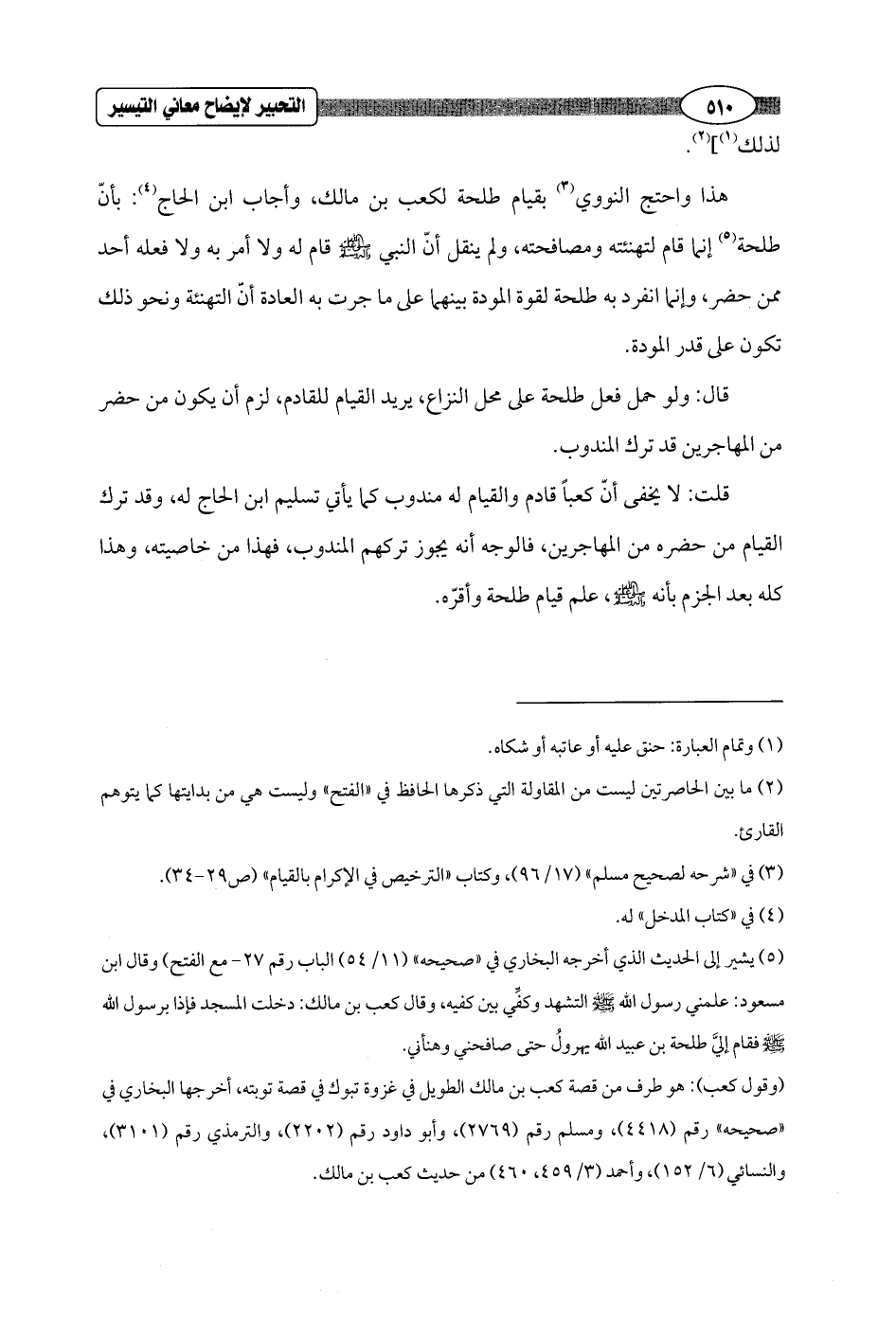 (¬5) يشير إلى الحديث الذي أخرجه البخاري في "صحيحه" (11/ 54) الباب رقم 27 - مع الفتح) وقال ابن مسعود: علمني رسول الله - صلى الله عليه وسلم - التشهد وكفِّي بين كفيه, وقال كعب بن مالك: دخلت المسجد فإذا برسول الله - صلى الله عليه وسلم - فقام إليَّ طلحة بن عبيد الله يهرولُ حتى صافحني وهنأني.