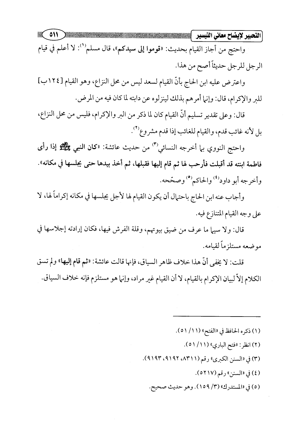 قلت: لا يخفى أنّ هذا خلاف ظاهر السياق، فإنها قالت عائشة: "ثم قام إليها" ولم تسق الكلام إلاّ لبيان الإكرام بالقيام، لا أن القيام غير مراد، وإنما هو مستلزم فإنه خلاف السياق.