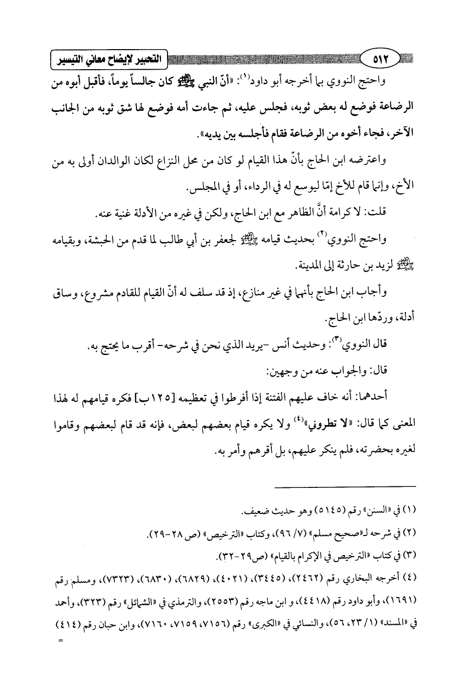 واعترضه ابن الحاج بأنّ هذا القيام لو كان من محل النزاع لكان الوالدان أولى به من الأخ، وإنما قام للأخ إمّا ليوسع له في الرداء، أو في المجلس.