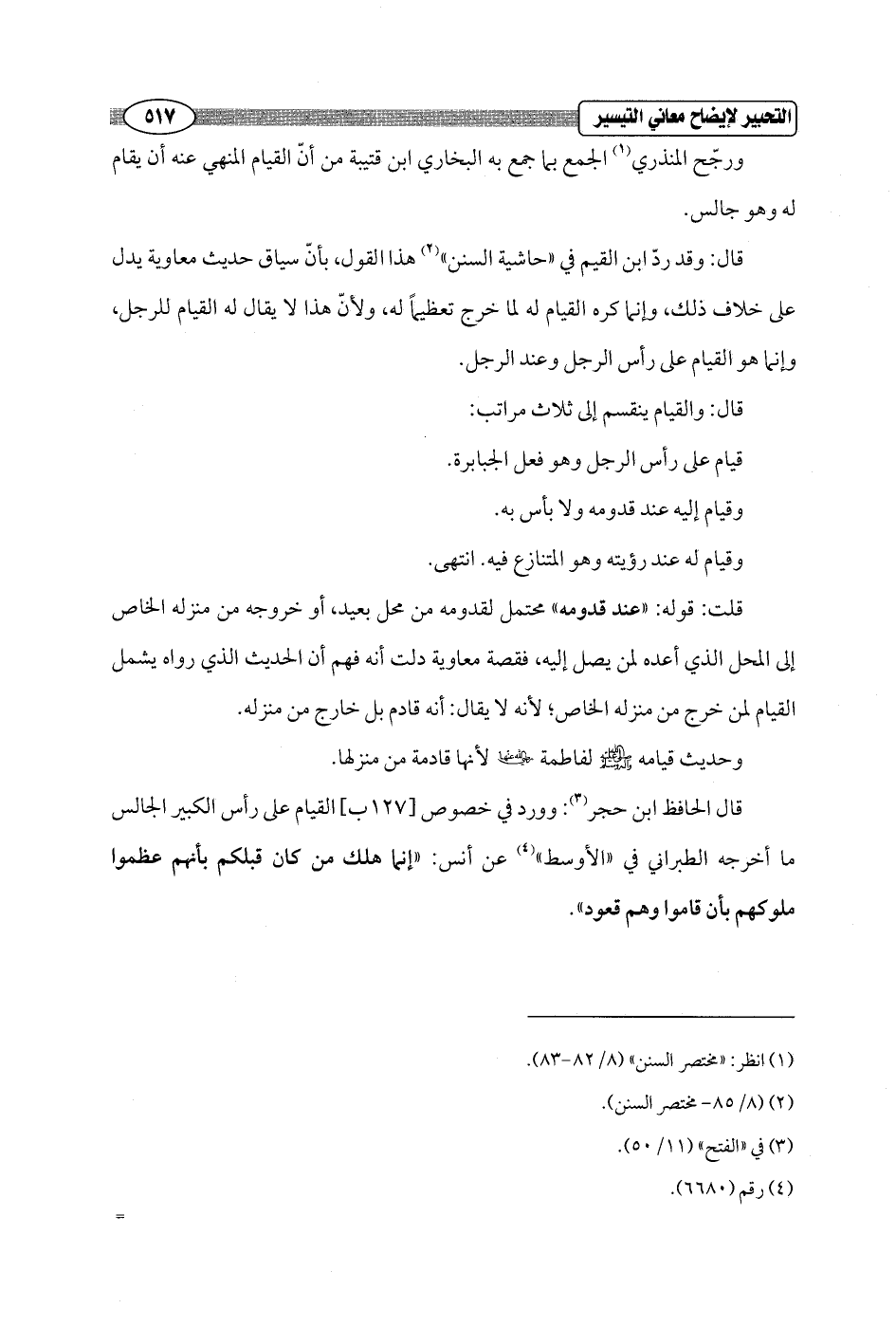 قال: وقد ردّ ابن القيم في "حاشية السنن" (¬2) هذا القول، بأنّ سياق حديث معاوية يدل على خلاف ذلك، وإنما كره القيام له لما خرج تعظيماً له، ولأنّ هذا لا يقال له القيام للرجل، وإنما هو القيام على رأس الرجل وعند الرجل.