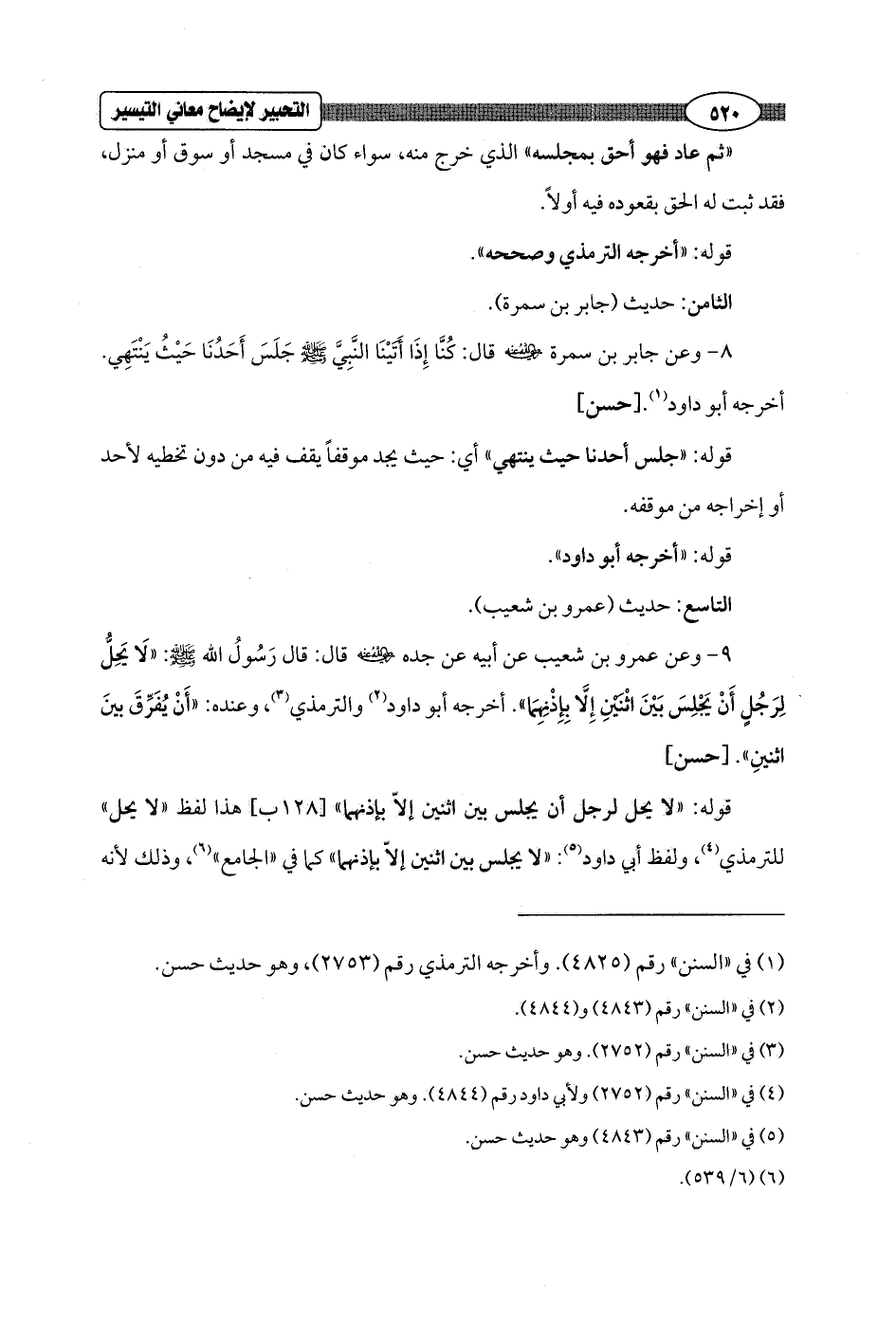 9 - وعن عمرو بن شعيب عن أبيه عن جده - رضي الله عنه - قال: قال رَسُولُ الله - صلى الله عليه وسلم -: "لَا يَحِلُّ لِرَجُلٍ أَنْ يَجْلِسَ بَيْنَ اثْنَيْنِ إِلا بِإِذْنِهِمَا". أخرجه أبو داود (¬2) والترمذي (¬3)، وعنده: "أَنْ يُفَرِّقَ بينَ اثنينِ". [حسن]