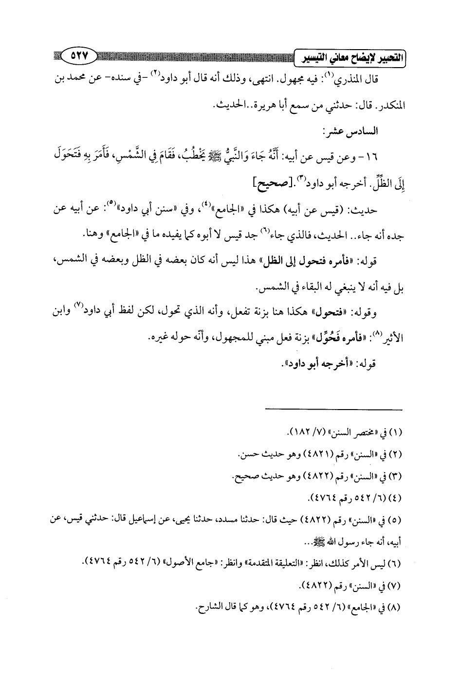 16 - وعن قيس عن أبيه: أنَّهُ جَاءَ وَالنَّبيُّ - صلى الله عليه وسلم - يَخْطُبُ، فَقَامَ فِي الشَّمْسِ، فَأَمَرَ بِهِ فَتَحَوَلَ إِلَى الظِّلِّ. أخرجه أبو داود (¬3). [صحيح]