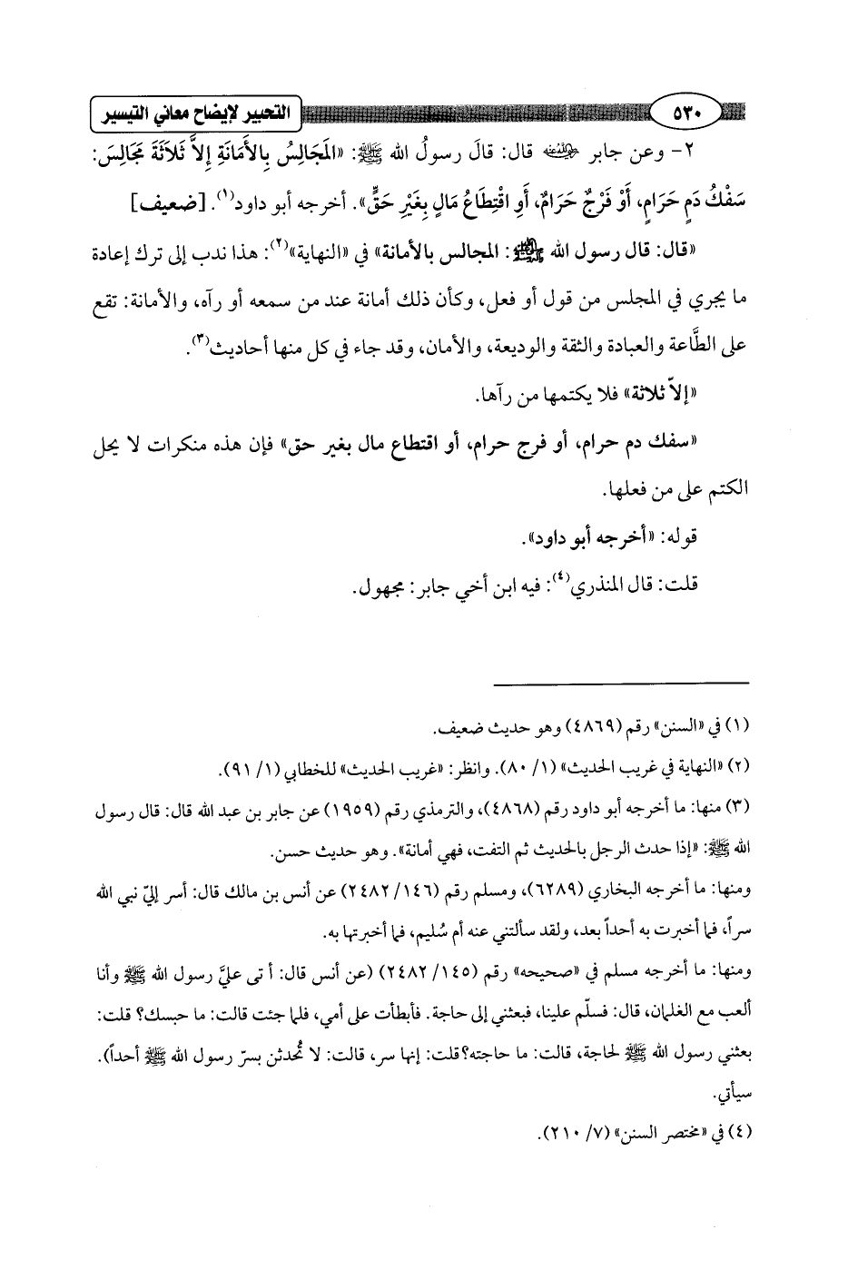 (¬3) منها: ما أخرجه أبو داود رقم (4868)، والترمذي رقم (1959) عن جابر بن عبد الله قال: قال رسول الله - صلى الله عليه وسلم -: "إذا حدث الرجل بالحديث ثم التفت، فهي أمانة". وهو حديث حسن.