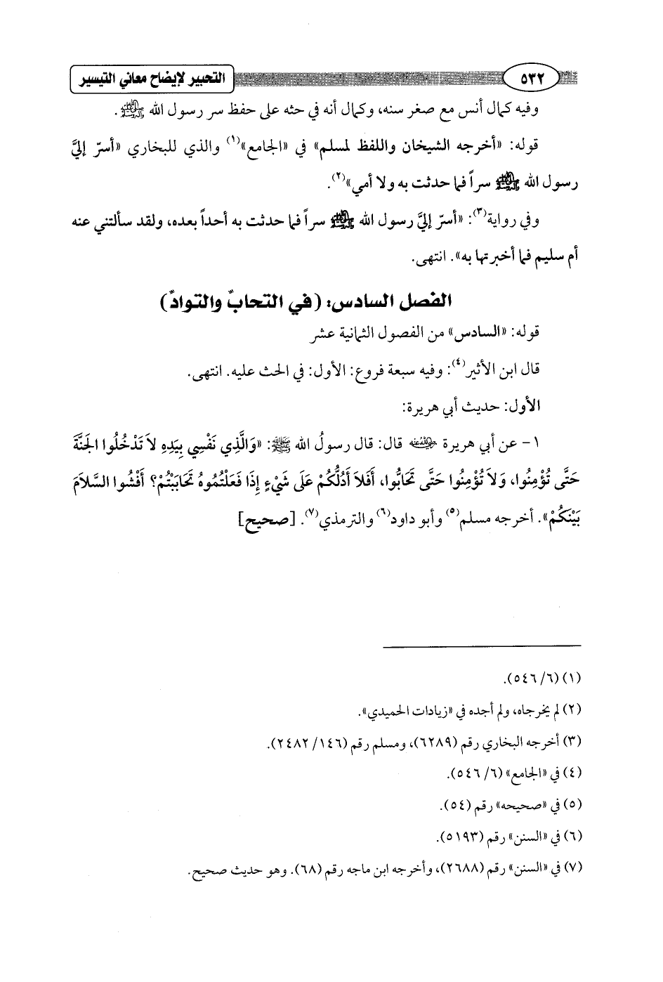 1 - عن أبي هريرة - رضي الله عنه - قال: قال رسولُ الله - صلى الله عليه وسلم -: "وَالَّذِي نَفْسِي بِيَدِهِ لاَ تَدْخُلُوا الجَنَّةَ حَتَّى تُؤْمِنُوا، وَلاَ تُؤْمِنُوا حَتَى تَحَابُّوا، أَفَلاَ أَدُلُّكُمْ عَلَى شَيْءٍ إِذَا فَعَلْتُمُوهُ تَحَابَبْتُمْ؟ أَفْشُوا السَّلاَمَ بَيْنَكُمْ". أخرجه مسلم (¬5) وأبو داود (¬6) والترمذي (¬7). [صحيح]