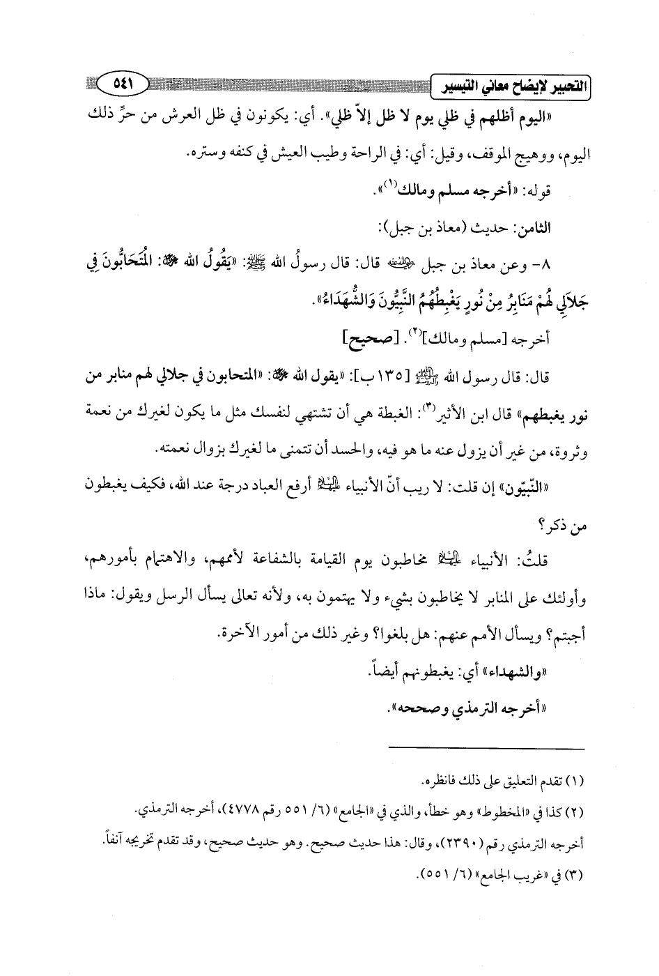 8 - وعن معاذ بن جبل - رضي الله عنه - قال: قال رسولُ الله - صلى الله عليه وسلم -: "يَقُولُ الله - عز وجل -: المتحَابُّونَ فِي جَلاَلِي لهُمْ مَنَابِرُ مِنْ نُورٍ يَغْبِطُهُمُ النَّبِيُّونَ وَالشُّهَدَاءُ".