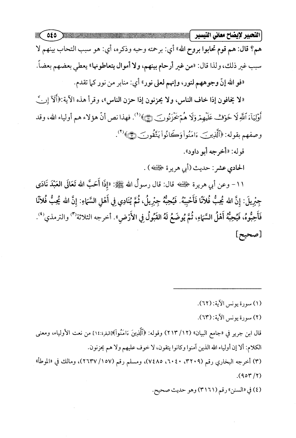 11 - وعن أبي هريرة - رضي الله عنه - قال: قال رسولُ الله - صلى الله عليه وسلم -: "إِذَا أَحَبَّ الله تَعَالَى العَبْدَ نَادَى جِبْرِيلَ: إِنَّ الله يُحِبُّ فُلَانًا فَأَحْبِبْهُ. فَيُحِبُّهُ جِبْرِيلُ، ثُمَّ يُنَادِي فِي أَهْلِ السَّمَاءِ: إِنَّ الله يُحِبُّ فُلانًا فَأَحِبُّوهُ، فَيُحِبُّهُ أَهْلُ السَّمَاءِ, ثُمَّ يُوضَعُ لَهُ القَبُولُ فِي الأَرْضِ". أخرجه الثلاثة (¬3) والترمذي (¬4). [صحيح]