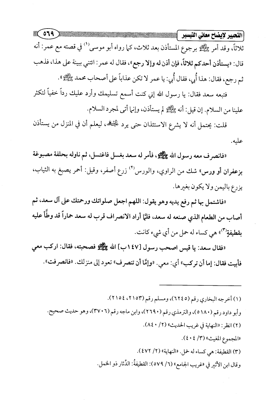 فتبعه سعد فقال: يا رسول الله إني كنت أسمع تسليمك وأرد عليك رداً خفياً لتكثر علينا من السلام. إن قيل: أنه - صلى الله عليه وسلم - لم يستأذن، وإنما أتى لمجرد السلام.