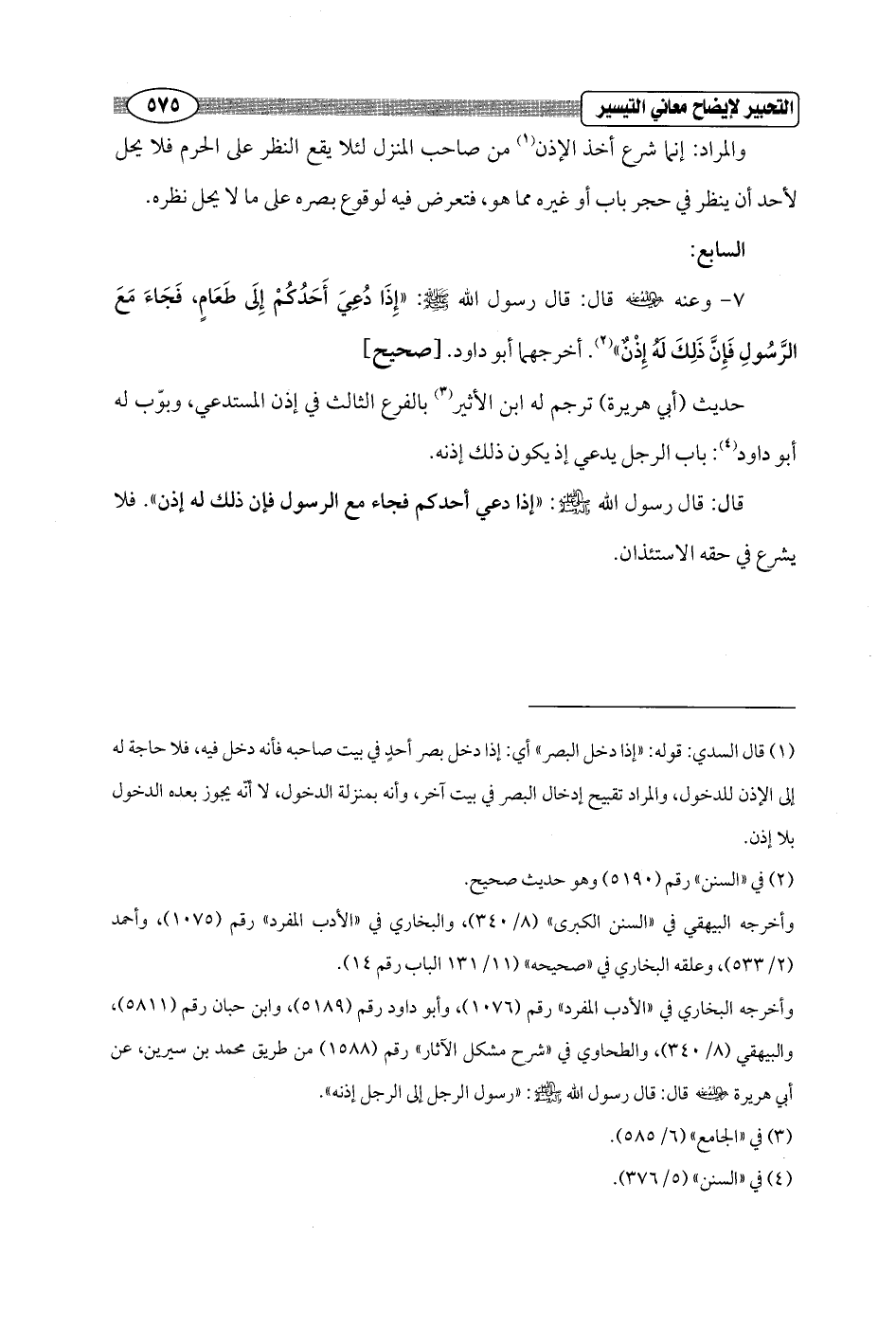 (¬1) قال السدي: قوله: "إذا دخل البصر" أي: إذا دخل بصر أحدٍ في بيت صاحبه فأنه دخل فيه، فلا حاجة له إلى الإذن للدخول، والمراد تقبيح إدخال البصر في بيت آخر، وأنه بمنزلة الدخول، لا أنه يجوز بعده الدخول بلا إذن.