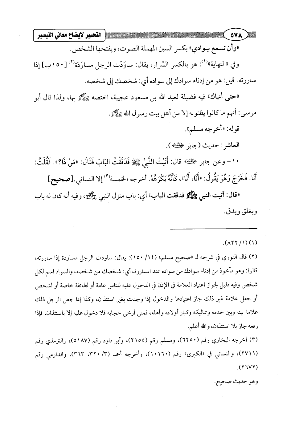 (¬2) قال النووي في شرحه لـ "صحيح مسلم" (14/ 150): يقال: ساودت الرجل مساودة إذا ساررته، قالوا: وهو مأخوذ من إدناء سوادك من سواده عند المساررة, أي: شخصك من شخصه, والسواد اسم لكل شخص وفيه دليل لجواز اعتماد العلامة في الإذن في الدخول عليه للناس عامة أو لطائفة خاصة أو لشخص أو جعل علامة غير ذلك جاز اعتمادها والدخول إذا وجدت بغير استئذان، وكذا إذا جعل الرجل ذلك علامة بينه وبين خدمه ومماليكه وكبار أولاده وأهله، فمتى أرخى حجابه فلا دخول عليه إلا باستئذان، فإذا رفعه جاز بلا استئذان، والله أعلم.