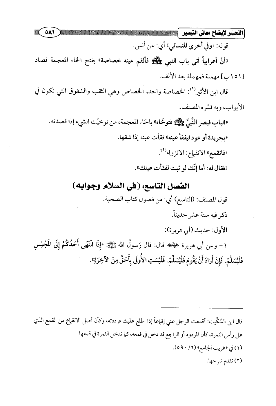 "أنّ أعرابياً أتى باب النبي - صلى الله عليه وسلم - فألقم عينه خصاصة" بفتح الخاء المعجمة فصاد [151 ب] مهملة فمهملة بعد الألف.