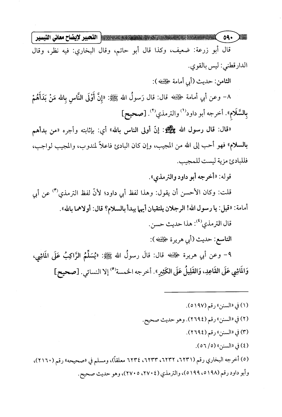 8 - وعن أبي أمامة - رضي الله عنه - قال: قال رَسولُ الله - صلى الله عليه وسلم -: "إِنَّ أَوْلَى النَّاسِ بِالله مَنْ بَدَأَهُمْ بِالسَّلَامِ". أخرجه أبو داود (¬1) والترمذي (¬2). [صحيح]