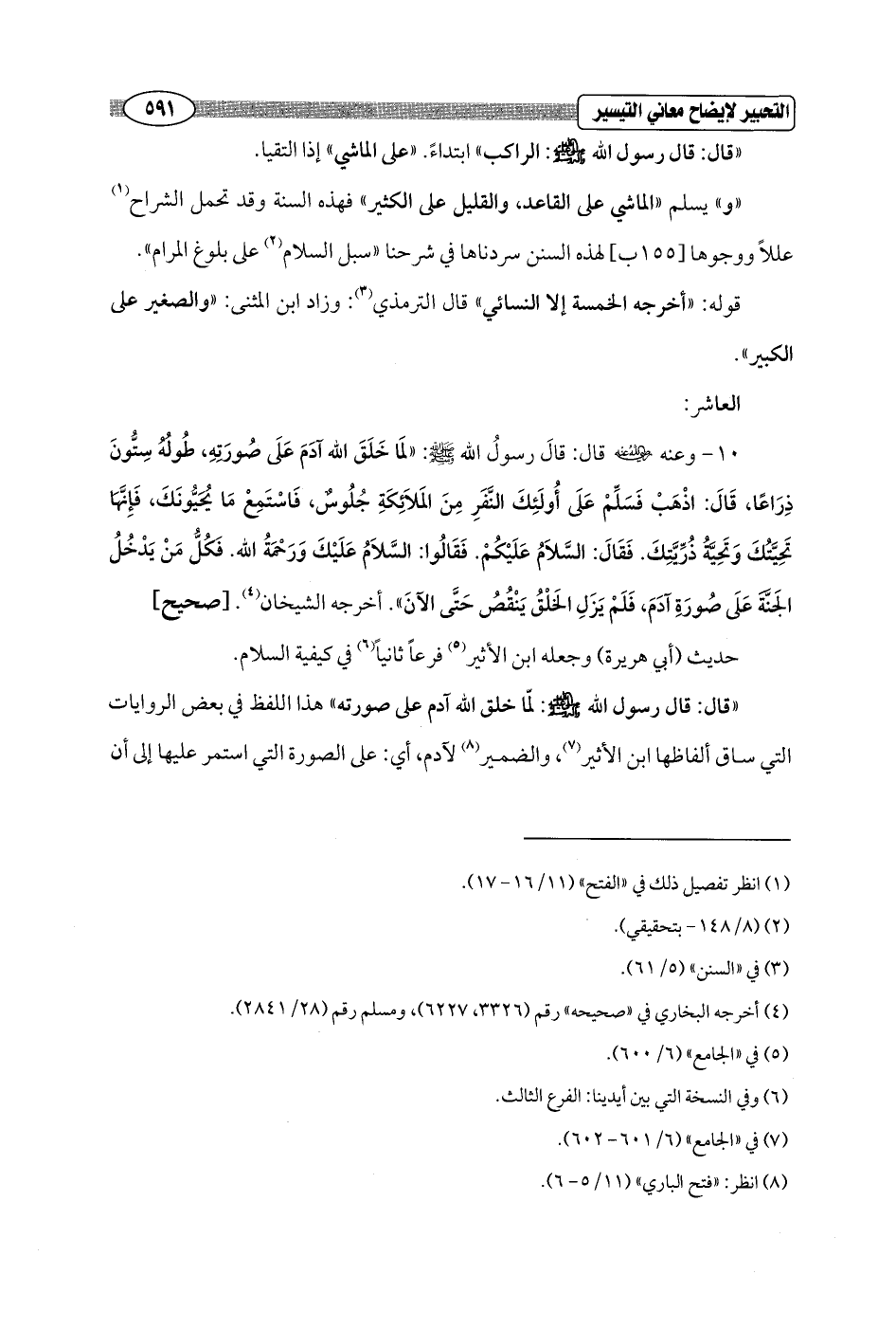 10 - وعنه - رضي الله عنه - قال: قَالَ رسولُ الله - صلى الله عليه وسلم -: "لمَا خَلَقَ الله آدَمَ عَلَى صُورَتِهِ، طُولُهُ سِتُّونَ ذِرَاعًا، قَالَ: اذْهَبْ فَسَلِّمْ عَلَى أُولَئِكَ النَّفَرِ مِنَ المَلاَئِكَةِ جُلُوسٌ، فَاسْتَمِعْ مَا يُحَيُّونَكَ، فَإِنَّهَا تَحِيَّتُكَ وَتَحِيَّةُ ذُرِّيَّتِكَ. فَقَالَ: السَّلاَمُ عَلَيْكُمْ. فَقَالُوا: السَّلاَمُ عَلَيْكَ ورَحْمَةُ الله. فَكُلُّ مَنْ يَدْخُلُ الجَنَّةَ عَلَى صُورَةِ آدَمَ، فَلَمْ يَزَلِ الخَلْقُ يَنْقُصُ حَتَّى الآنَ". أخرجه الشيخان (¬4). [صحيح]