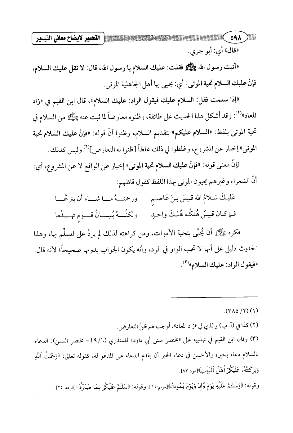 فكره - صلى الله عليه وسلم - أن يُحيَّى بتحية الأموات، ومن كراهته لذلك لم يردَّ على المسلِّم بها، وهذا الحديث دليل على أنها لا تجب الواو في الرد، وأنه يكون الجواب بدونها صحيحاً؛ لأنه قال: "فيقول الراد: عليك السلام" (¬3).