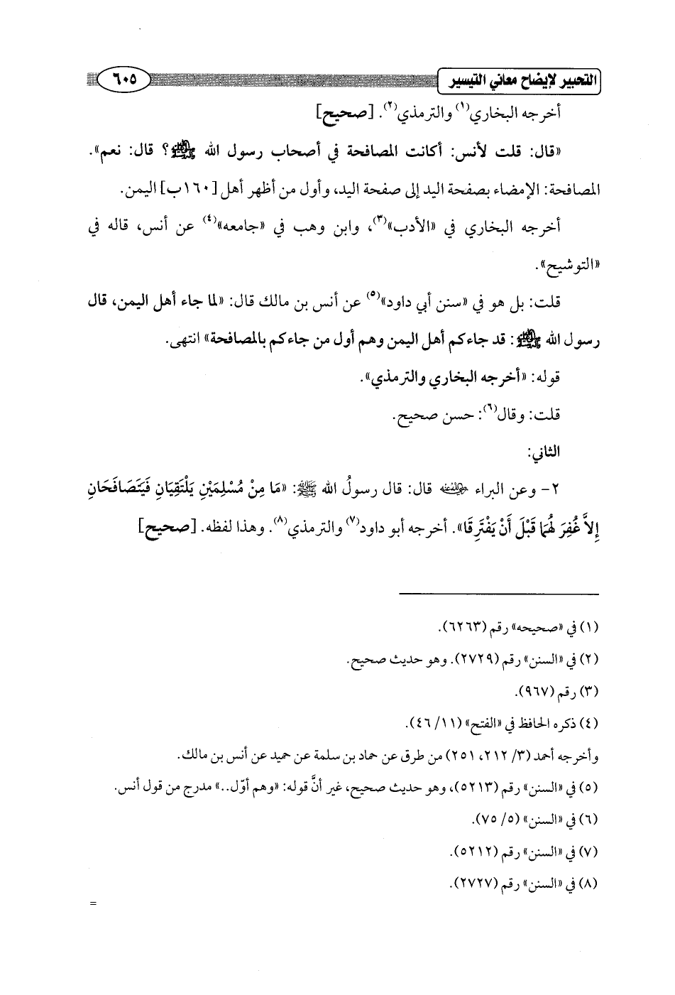 "قال: قلت لأنس: أكانت المصافحة في أصحاب رسول الله - صلى الله عليه وسلم -؟ قال: نعم". المصافحة: الإمضاء بصفحة اليد إلى صفحة اليد، وأول من أظهر أهل [160 ب] اليمن.