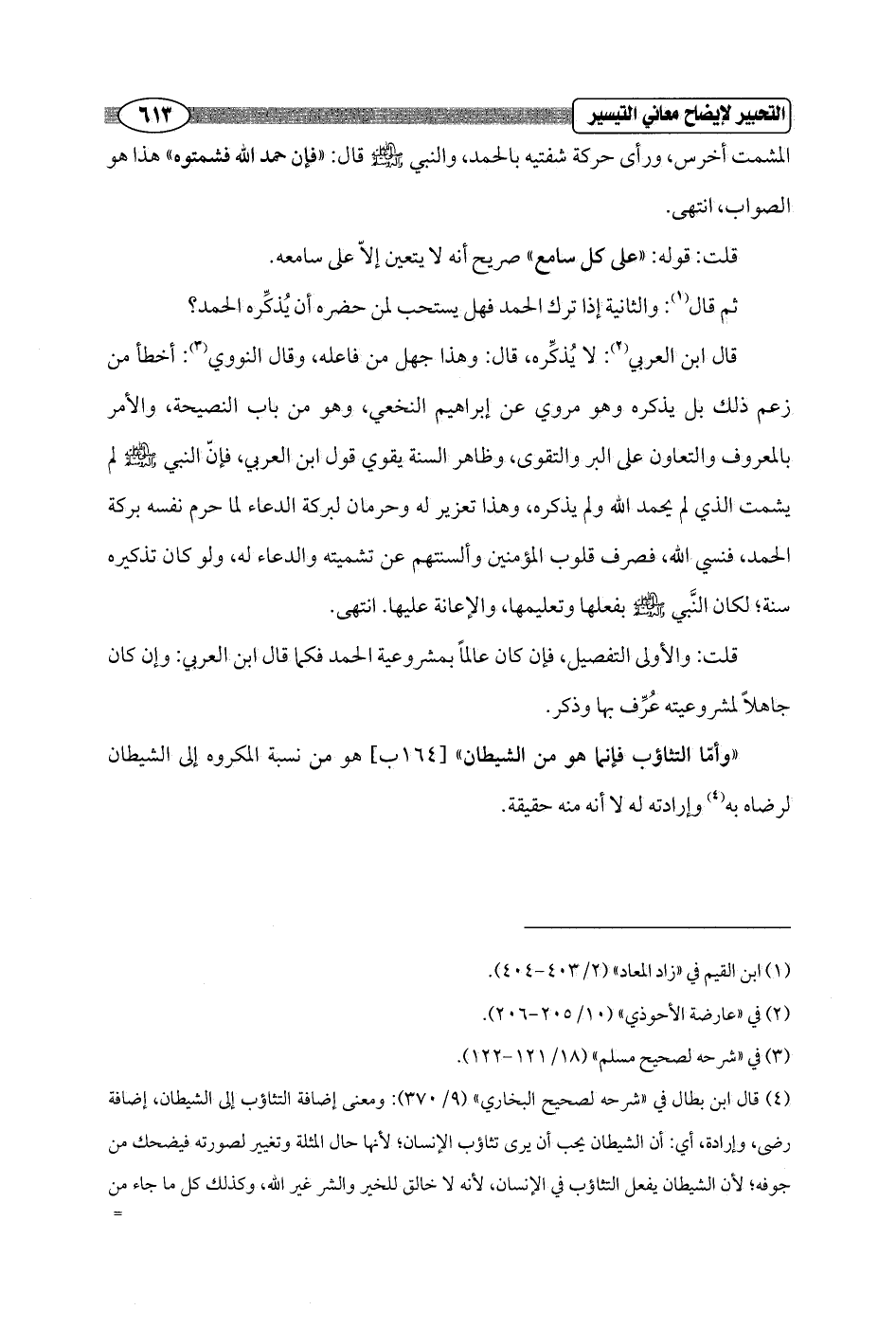 "وأمّا التثاؤب فإنما هو من الشيطان" [164 ب] هو من نسبة المكروه إلى الشيطان لرضاه به (¬4) وإرادته له لا أنه منه حقيقة.