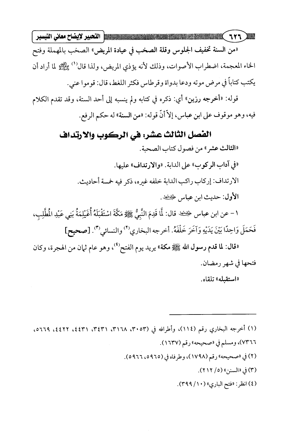 1 - عن ابن عباس - رضي الله عنهما - قال: لمَّا قَدِمَ النَّبِيُّ - صلى الله عليه وسلم - مَكَّةَ اسْتَقْبَلَهُ أُغَيْلِمَةُ بَنِي عَبْدِ المُطَّلِبِ، فَحَمَلَ وَاحِدًا بَيْنَ يَدَيْهِ وَآخَرَ خَلْفَهُ. أخرجه البخاري (¬2) والنسائي (¬3). [صحيح]