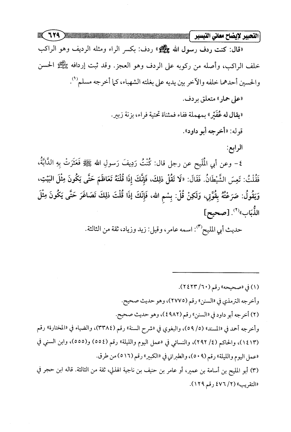 4 - وعن أبي المُلَيح عن رجل قال: كُنْتُ رَدِيفَ رَسولِ الله - صلى الله عليه وسلم - فَعَثَرَتْ بِهِ الدَّابَّةُ، فَقُلْتُ: تَعِسَ الشَيْطَانُ. فَقَالَ: "لَا تَقُلْ ذلِكَ، فَإِنَّكَ إِذَا قُلْتَهُ تَعَاظَمَ حَتَّى يَكُونَ مِثْلَ البَيْتِ، وَيَقُولُ: صَرَعْتُهُ بِقُوَّتِي، وَلَكِنْ قُلْ: بِسْمِ الله, فَإِنّكَ إذَا قُلْتَ ذلِكَ تَصَاغَرَ حَتَّى يَكُونَ مِثْلَ الذُّبَاب" (¬2). [صحيح]
