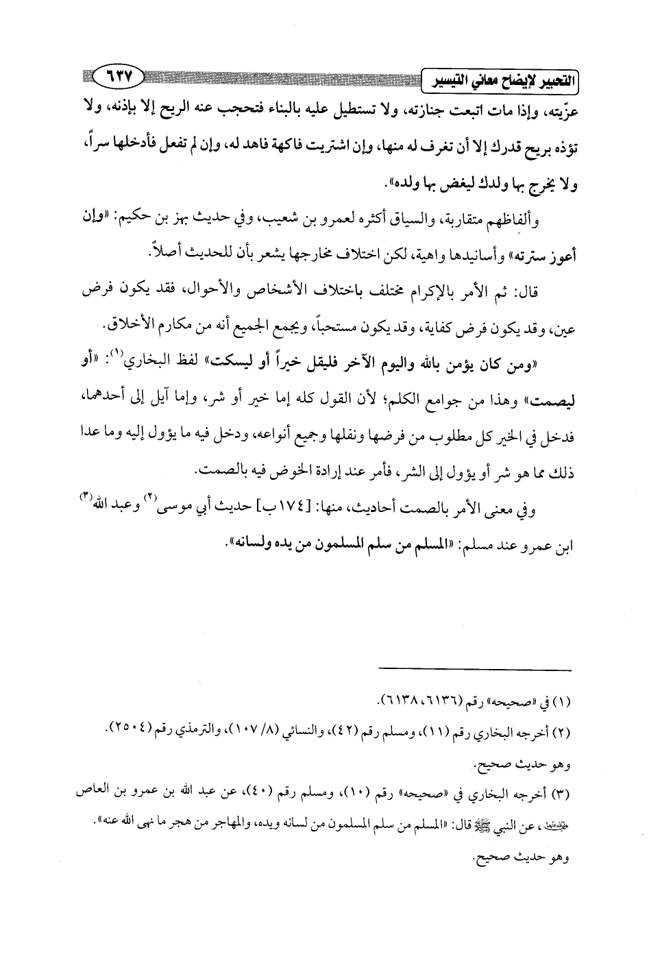 (¬3) أخرجه البخاري في "صحيحه" رقم (10)، ومسلم رقم (40)، عن عبد الله بن عمرو بن العاص - رضي الله عنهما -، عن النبي - صلى الله عليه وسلم - قال: "المسلم من سلم المسلمون من لسانه ويده، والمهاجر من هجر ما نهى الله عنه".
