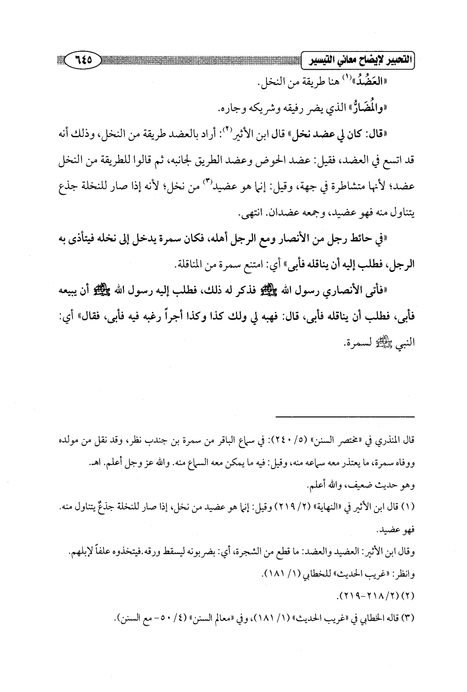 "قال: كان لي عضد نخل" قال ابن الأثير (¬2): أراد بالعضد طريقة من النخل، وذلك أنه قد اتسع في العضد، فقيل: عضد الحوض وعضد الطريق لجانبه، ثم قالوا للطريقة من النخل عضد؛ لأنها متشاطرة في جهة، وقيل: إنما هو عضيد (¬3) من نخل؛ لأنه إذا صار للنخلة جذع يتناول منه فهو عضيد، وجمعه عضدان. انتهى.