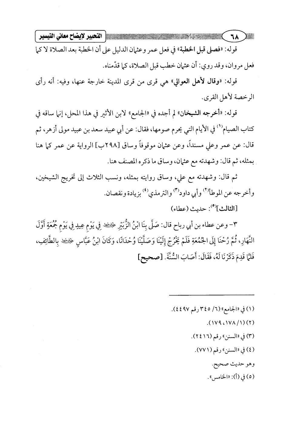 3 - وعن عطاء بن أبي رباح قال: صلَّى بِنَا ابْنُ الزُّبَيْرِ - رضي الله عنهما - في يَوْمِ عِيدٍ في يَوْمِ جُمُعَةٍ أَوَّلَ النَّهَارِ، ثُمَّ رُحْنَا إِلَى الجُمُعَةِ فَلَمْ يَخْرُجْ إِلَيْنَا وَصَلَّيْنَا وُحْدَانًا، وَكَانَ ابْنُ عَبَّاسٍ - رضي الله عنهما - بِالطَّائِفِ، فَلمَّا قَدِمَ ذَكَرْنَا لَهُ، فَقَالَ: أَصَابَ السُّنَّةَ. [صحيح]