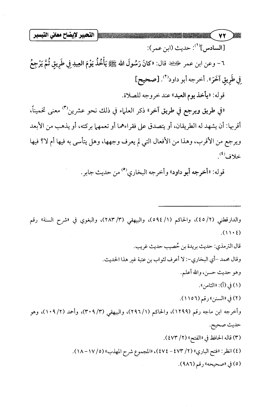 6 - وعن ابن عمر - رضي الله عنهما - قال: "كانَ رَسُولَ الله - صلى الله عليه وسلم - يَأْخُذُ يَوْمَ العِيدِ في طَرِيقٍ ثُمَّ يَرْجعُ في طَرِيقٍ آخَرَ". أخرجه أبو داود (¬2). [صحيح]