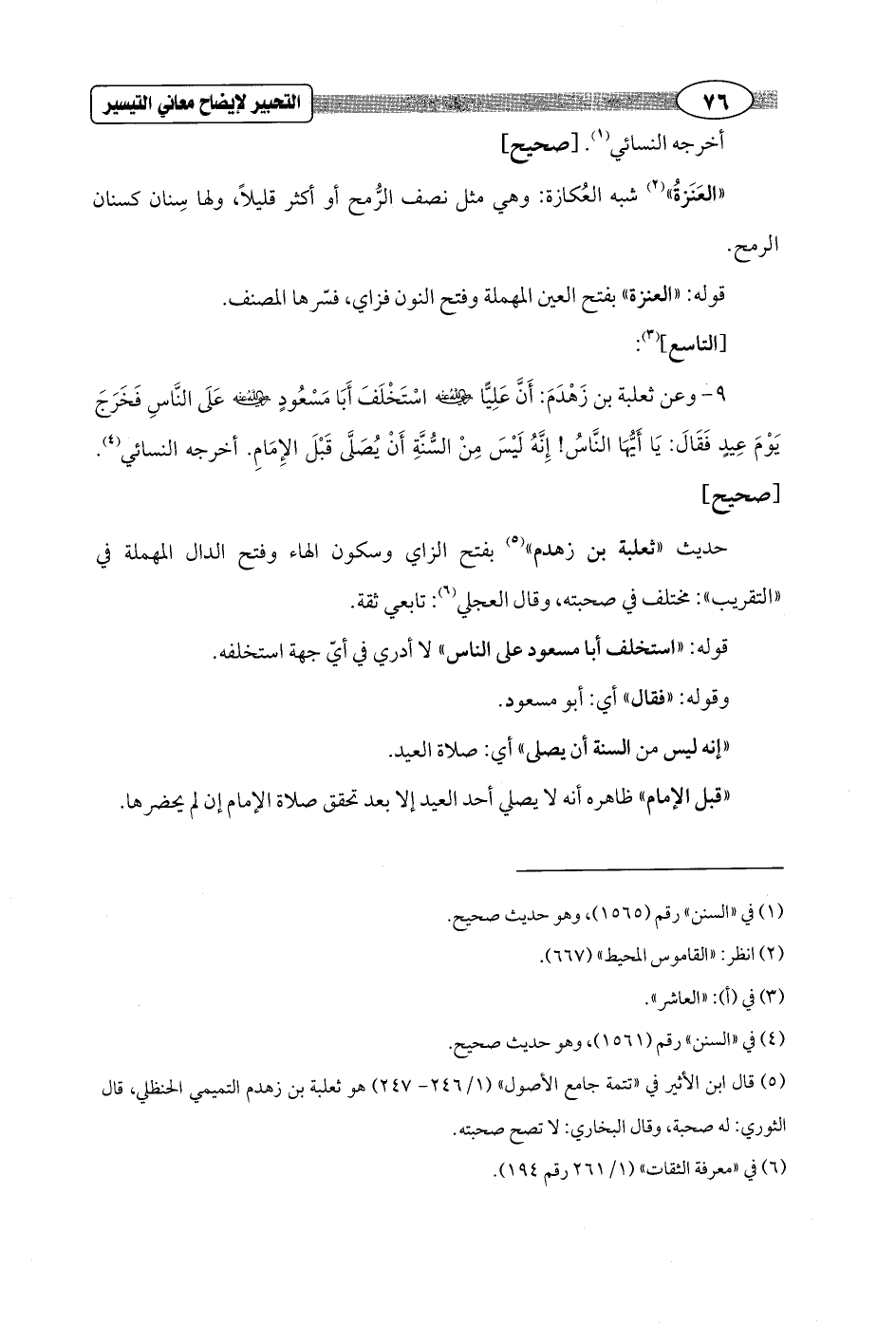9 - وعن ثعلبة بن زَهْدَمَ: أَنَّ عَلِيًّا - رضي الله عنه - اسْتَخْلَفَ أَبَا مَسْعُودٍ - رضي الله عنه - عَلَى النَّاسِ فَخَرَجَ يَوْمَ عِيدٍ فَقَالَ: يَا أَيُّهَا النَّاسُ! إِنَّهُ لَيْسَ مِنْ السُّنَّةِ أَنْ يُصَلَّى قَبْلَ الإِمَامِ. أخرجه النسائي (¬4). [صحيح]