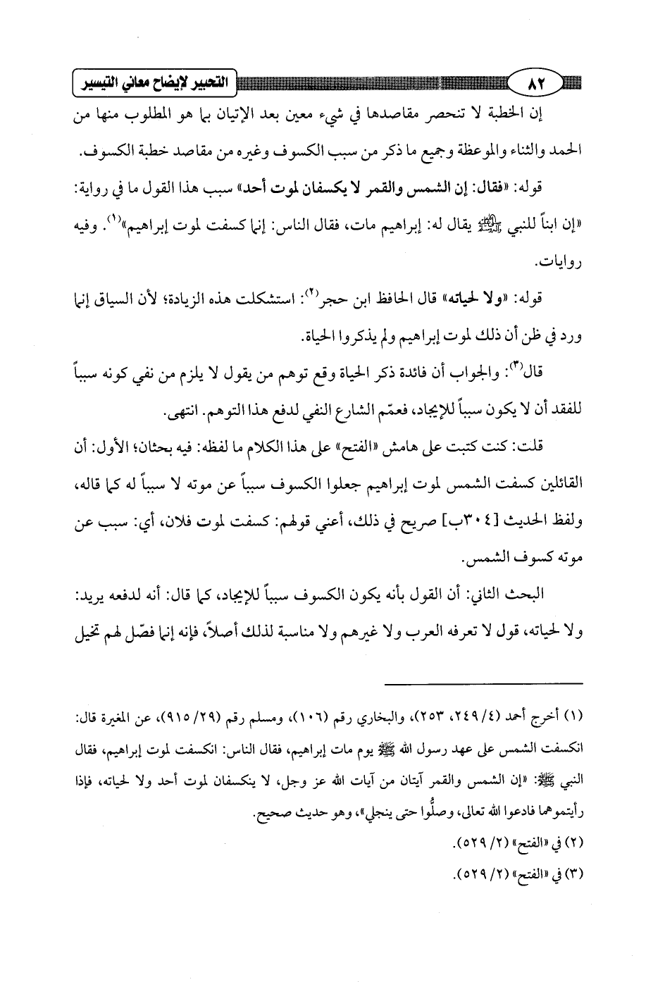(¬1) أخرج أحمد (4/ 249، 253)، والبخاري رقم (106)، ومسلم رقم (29/ 915)، عن المغيرة قال: انكسفت الشمس على عهد رسول الله - صلى الله عليه وسلم - يوم مات إبراهيم، فقال الناس: انكسفت لموت إبراهيم، فقال النبي - صلى الله عليه وسلم -: "إن الشمس والقمر آيتان من آيات الله عَزَّ وَجَلَّ، لا ينكسفان لموت أحد ولا لحياته" فإذا رأيتموهما فادعوا الله تعالى، وصلُّوا حتى ينجلي"، وهو حديث صحيح.