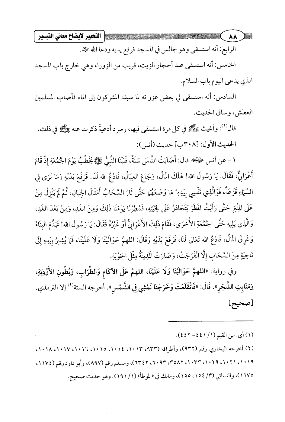 1 - عن أنس - رضي الله عنه - قال: أَصَابَتْ النَّاسَ سَنَةٌ، فَبَيْنَا النَّبِيُّ - صلى الله عليه وسلم - يَخْطُبُ يَوْمَ الجُمُعَةِ إِذْ قَامَ أَعْرَابِيٌّ، فَقَالَ: يَا رَسُولَ الله! هَلَكَ المَالُ، وَجَاعَ العِيَالُ، فَادْعُ الله لَنَا. فَرَفَعَ يَدَيْهِ وَمَا نَرَى فِي السَّمَاءِ قَزَعَةٌ، فَوَالَّذِي نَفْسِي بِيَدهِ! مَا وَضَعَهُمَا حَتَّى ثَارَ السَّحَابُ أَمْثَالَ الجِبَالِ، ثُمَّ لم يَنْزِلْ مِنْ عَلَى المِنْبَرِ حَتَّى رَأَيْتُ المَطَرَ يَتَحَادَرُ عَلَى لِحْيَتِهِ, فَمُطِرْنَا يَوْمَنَا ذَلِكَ وَمِنْ الغَدِ، وَمنْ بَعْدَ الغَدِ، وَالَّذِي يَلِيهِ حَتَّى الجُمُعَةِ الأُخْرَى، فَقَامَ ذَلِكَ الأَعْرَابِيُّ أَوْ غَيْرُهُ فَقَالَ: يَا رَسُولَ الله! تَهَدَّمَ البِنَاءُ وَغَرِقَ المَالُ، فَادْعُ الله تَعَالى لَنَا، فَرَفَعَ يَدَيْهِ وَقَالَ: اللهمَّ حَوَالَيْنَا وَلَا عَلَيْنَا، فَما يُشِيرُ بِيَدهِ إِلَى نَاحِية مِن السَّحَابِ إِلَّا انْفَرَجَتْ، وَصَارَتْ المَدِينَةُ مِثْلَ الجَوْبَةِ.