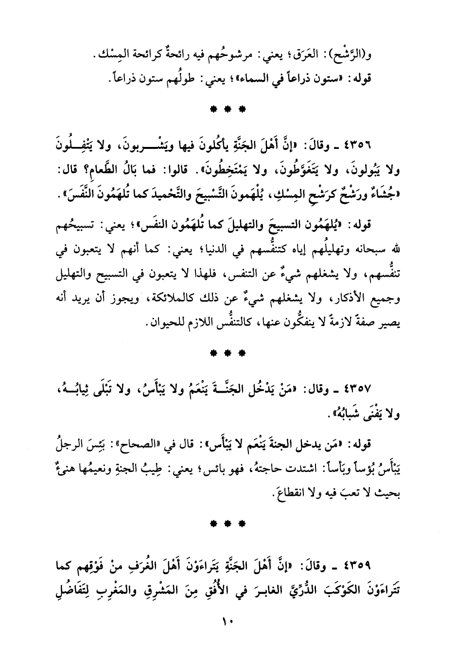 4356 - وقالَ: "إنَّ أَهْلَ الجَنَّةِ يأكُلونَ فيها ويَشْربونَ، ولا يَتْفِلُونَ ولا يَبُولونَ، ولا يَتَغَوَّطُونَ، ولا يَمْتَخِطُونَ". قالوا: فما بَالُ الطَّعامِ؟ قال: "جُشَاءٌ ورَشْحٌ كرَشْحِ المِسْكِ، يُلْهَمونَ التَّسْبيحَ والتَّحْميدَ كما تُلهَمُونَ النَّفَسَ".