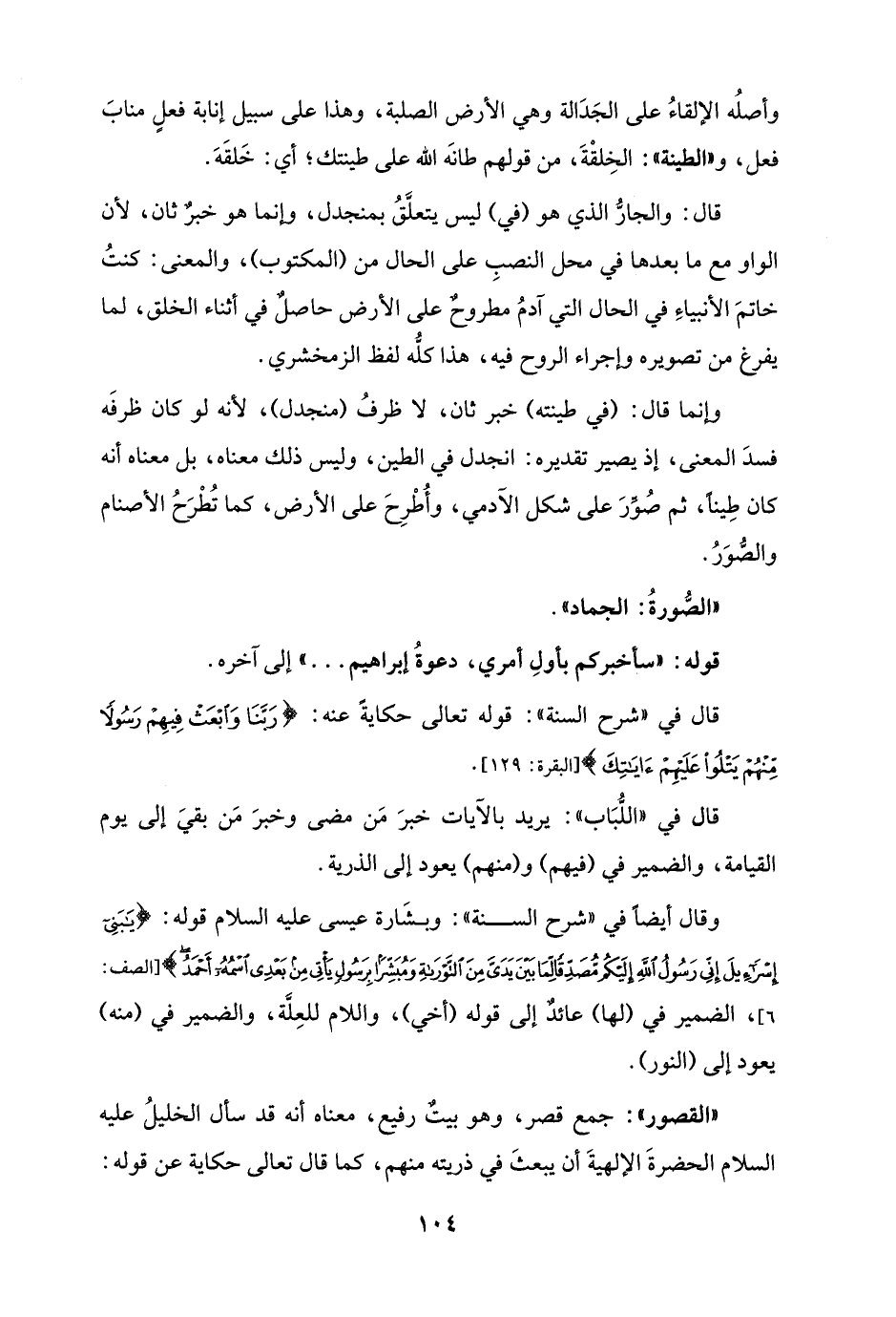 قال: والجارُّ الذي هو (في) ليس يتعلَّقُ بمنجدل، وإنما هو خبرٌ ثان، لأن الواو مع ما بعدها في محل النصبِ على الحال من (المكتوب)، والمعنى: كنتُ خاتمَ الأنبياءِ في الحال التي آدمُ مطروحٌ على الأرض حاصلٌ في أثناء الخلق، لما يفرغ من تصويره وإجراء الروح فيه، هذا كلُّه لفظ الزمخشري.