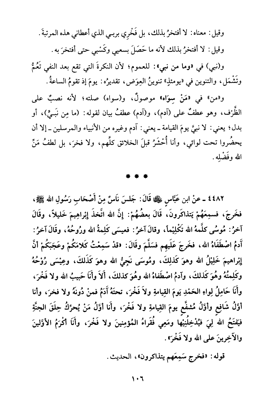 4482 - عنْ ابن عَبَّاسٍ - رضي الله عنهما - قَالَ: جَلسَ نَاسٌ مِنْ أَصْحَابِ رَسُولِ الله - صلى الله عليه وسلم -، فخَرجَ، فسمِعَهُمْ يَتذاكَرونَ، قَالَ بعضُهُمْ: إِنَّ الله اتَّخذَ إِبْراهِيمَ خَليلاً، وقَالَ آخرُ: مُوسُى كلَّمهُ الله تَكْلِيْمًا، وقالَ آخرُ: فعيسَى كَلِمةُ الله ورُوحُهُ، وقَالَ آخرُ: آدمُ اصْطَفَاهُ الله، فخَرجَ عَلَيهِم فسَلَّمَ وقَالَ: "قدْ سَمِعْتُ كَلامَكُمْ وعَجَبَكُمْ أنَّ إِبْراهيمَ خَلِيْلُ الله وهوَ كذلِكَ، ومُوسَى نَجيُّ الله وهوَ كذَلكَ، وعِيْسَى رُوْحُهُ وكَلِمتُهُ وهُوَ كذلكَ، وآدمُ اصْطَفاهُ الله وهُوَ كذلكَ، أَلاَ وأَنَا حَبيبُ الله ولا فَخْرَ، وأَناَ حَامِلُ لِواءِ الحَمْدِ يَومَ القِيامةِ ولاَ فَخْرَ، تحتَهُ آدَمُ فمنْ دُونَهُ ولا فخرَ، وأنا أوَّلُ شَافِعٍ وأوَّلُ مُشفَّعٍ يومَ القِيامةِ ولا فَخْرَ، وأَنا أوَّلُ مَنْ يُحرِّكُ حِلَقَ الجنَّةِ فيَفتَحُ الله لِيَ فيُدْخِلُنِيْها ومَعِي فُقَراءُ المُؤمِنينَ ولا فَخْرَ، وأَنَا أكْرَمُ الأوَّلينَ والآخِرينَ على الله ولا فَخْرَ".
