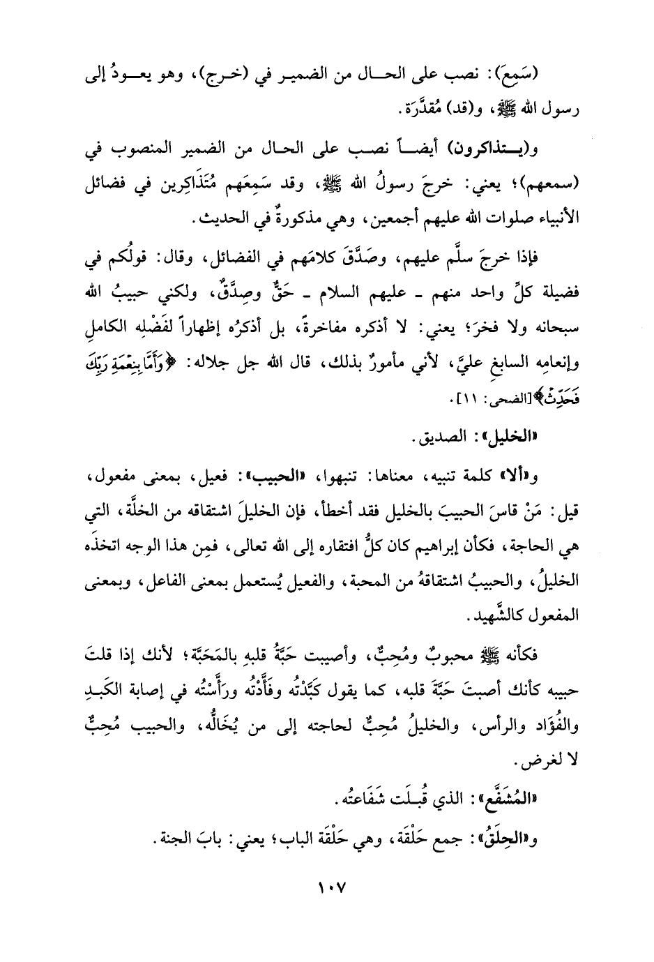 و"ألا" كلمة تنبيه، معناها: تنبهوا، "الحبيب": فعيل، بمعنى مفعول، قيل: مَنْ قاسَ الحبيبَ بالخليل فقد أخطأ، فإن الخليلَ اشتقاقه من الخلَّة، التي هي الحاجة، فكأن إبراهيم كان كلُّ افتقاره إلى الله تعالى، فمِن هذا الوجه اتخذَه الخليلُ، والحبيبُ اشتقاقهُ من المحبة، والفعيل يُستعمل بمعنى الفاعل، وبمعنى المفعول كالشَّهيد.