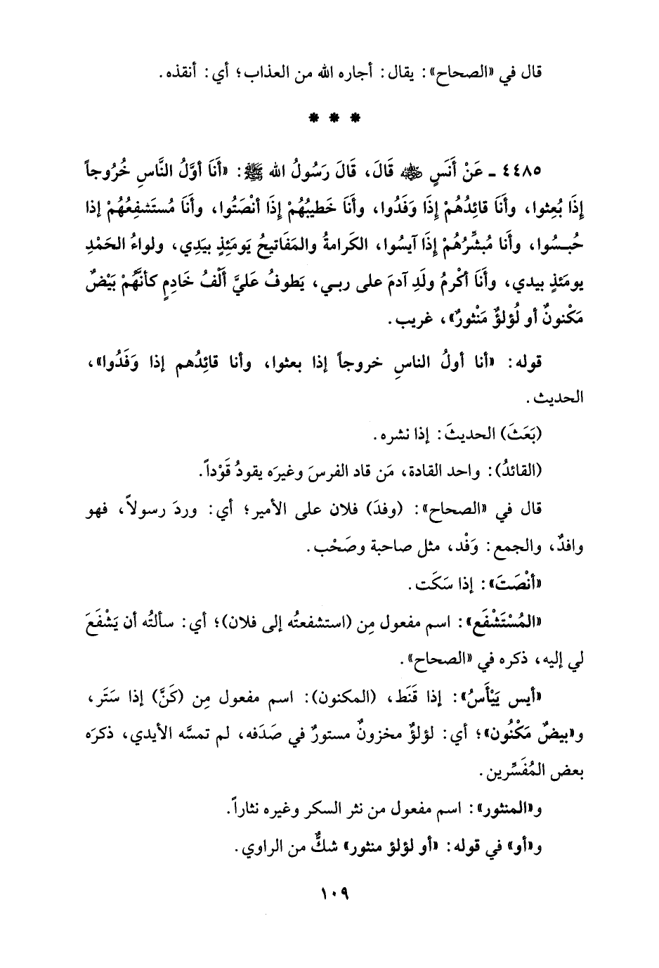 4485 - عَنْ أَنَسٍ - رضي الله عنه - قَالَ، قَالَ رَسُولُ الله - صلى الله عليه وسلم -: "أَنَا أوَّلُ النَّاسِ خُرُوجًا إذَا بُعِثوا، وأَنَا قائِدُهُمْ إِذَا وَفَدُوا، وأَنَا خَطيبُهُمْ إذَا أنْصَتُوا، وأَنَا مُستَشفِعُهُمْ إذا حُبسُوا، وأَنا مُبشَّرُهُمْ إذَا آيسُوا، الكَرامةُ والمَفَاتيحُ يَومَئِذٍ بيَدِي، ولواءُ الحَمْدِ يومَئذٍ بيدي، وأَنَا أكْرمُ ولَدِ آدمَ على ربي، يَطوفُ عَليَّ ألفُ خَادِمٍ كأنَّهُمْ بَيْضٌ مَكْنونٌ أو لُؤلؤٌ مَنْثورٌ"، غريب.