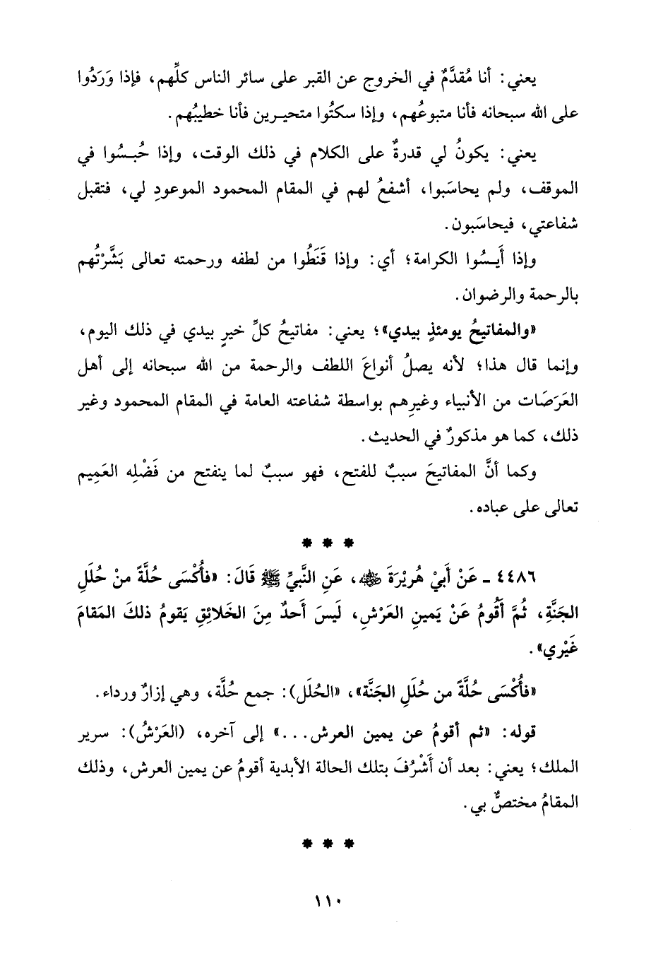 4486 - عَنْ أَبيْ هُريْرَةَ - رضي الله عنه -، عَنِ النَّبيِّ - صلى الله عليه وسلم - قَالَ: "فأُكْسَى حُلَّةً منْ حُلَلِ الجَنَّةِ، ثُمَّ أقومُ عَنْ يَمينِ العَرْشِ، لَبسَ أَحدٌ مِنَ الخَلائِقِ يَقومُ ذلكَ المَقامَ غَيْري".