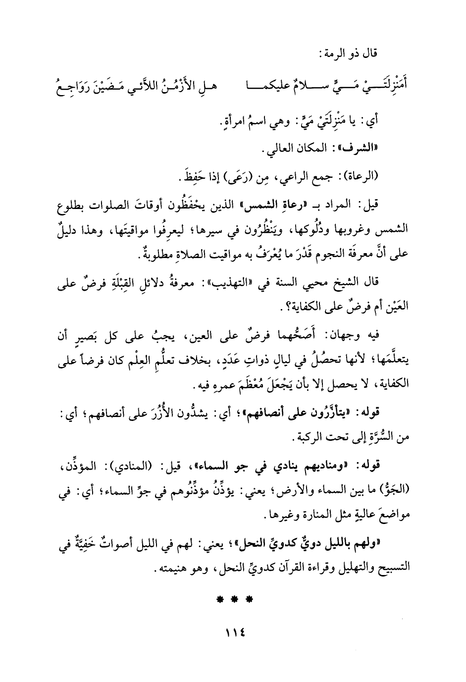 قيل: المراد بـ "رعاةِ الشمس" الذين يحْفَظُون أوقاتَ الصلوات بطلوع الشمس وغروبها ودُلُوكها، وَينْظُرُون في سيرها؛ ليعرِفُوا مواقيتَها، وهذا دليلٌ على أنَّ معرفَة النجوم قَدْرَ ما يُعْرَفُ به مواقيت الصلاةِ مطلوبةٌ.