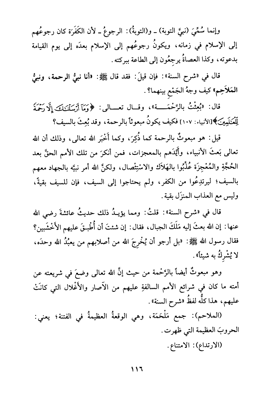 وهو مبعوثٌ أيضًا بالرَّحْمة من حيث إنَّ الله تعالى وضعَ في شريعته عن أمته ما كان في شرائع الأمم السالفةِ عليهم من الآصار والأَغْلال التي كانَتْ عليهم، هذا كلُّه لفظُ "شرح السنة".
