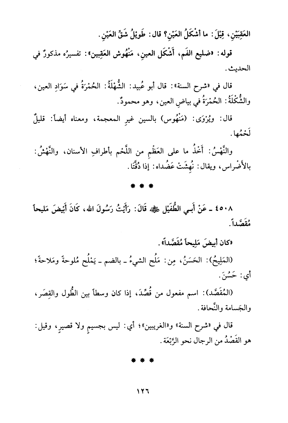 4508 - عَنْ أَبي الطُّفَيْل - رضي الله عنه - قَالَ: رَأَيْتُ رَسُولَ الله، كَانَ أَبْيضَ مَليحًا مُقَصَّدًا.