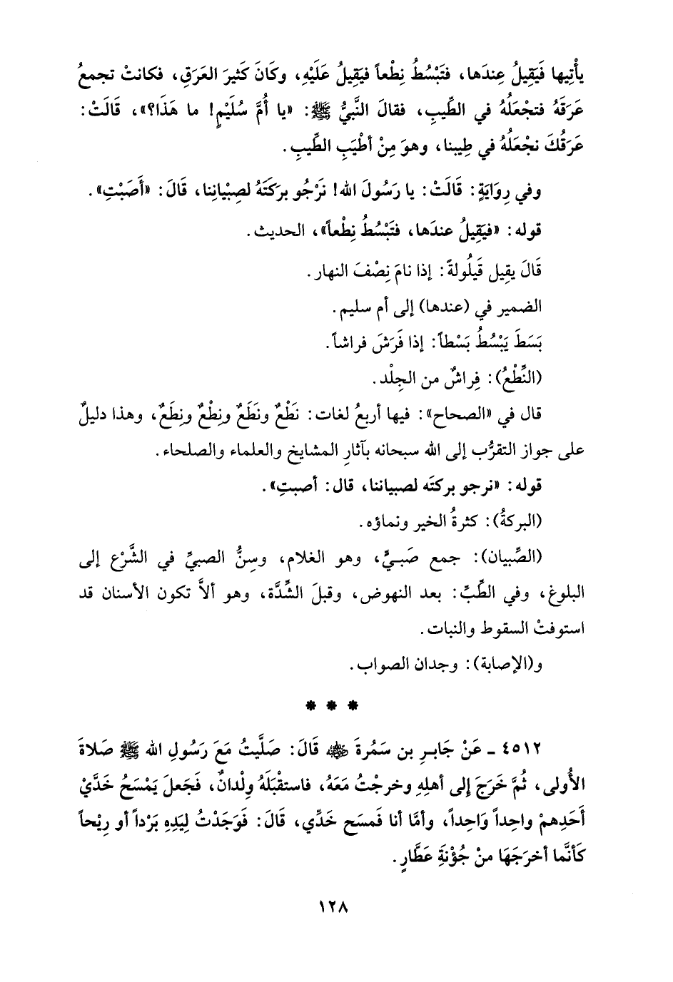 4512 - عَنْ جَابرِ بن سَمُرةَ - رضي الله عنه - قَالَ: صَلَّيتُ مَعَ رَسُولِ الله - صلى الله عليه وسلم - صَلاةَ الأُولى، ثُمَّ خَرَجَ إلى أهلِهِ وخرجْتُ مَعَهُ، فاستقْبَلَهُ وِلْدانٌ، فَجَعلَ يَمْسَحُ خَدَّيْ أَحَدِهمْ واحِدًا وَاحِدًا، وأمَّا أنا فَمسَح خَدِّي، قَالَ: فَوَجَدْتُ لِيَدِهِ بَرْدًا أو رِيحًا كَأنَّما أخرَجَهَا منْ جُؤْنَةِ عَطَّارٍ.