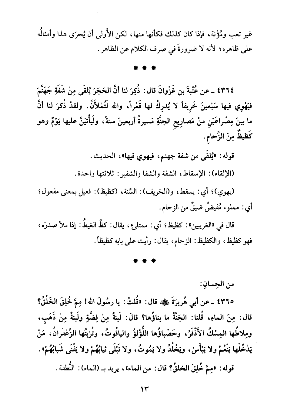 4364 - عن عُتْبةَ بن غَزْوانَ قال: ذُكِرَ لنا أنَّ الحَجَرَ يُلقَى مِنْ شَفَةِ جَهَنَّمَ فيَهْوِي فيها سَبْعينَ خَرِيفًا لا يُدرِكُ لها قَعْرًا، والله لَتُمْلأَنَّ. ولقدْ ذكرَ لنا أنَّ ما بينَ مِصْراعَيْنِ منْ مَصارِيعِ الجنَّةِ مَسيرةُ أربعينَ سنةً، ولَيأْتيَنَّ عليها يَوْمٌ وهو كَظيظٌ مِنَ الزِّحامِ.