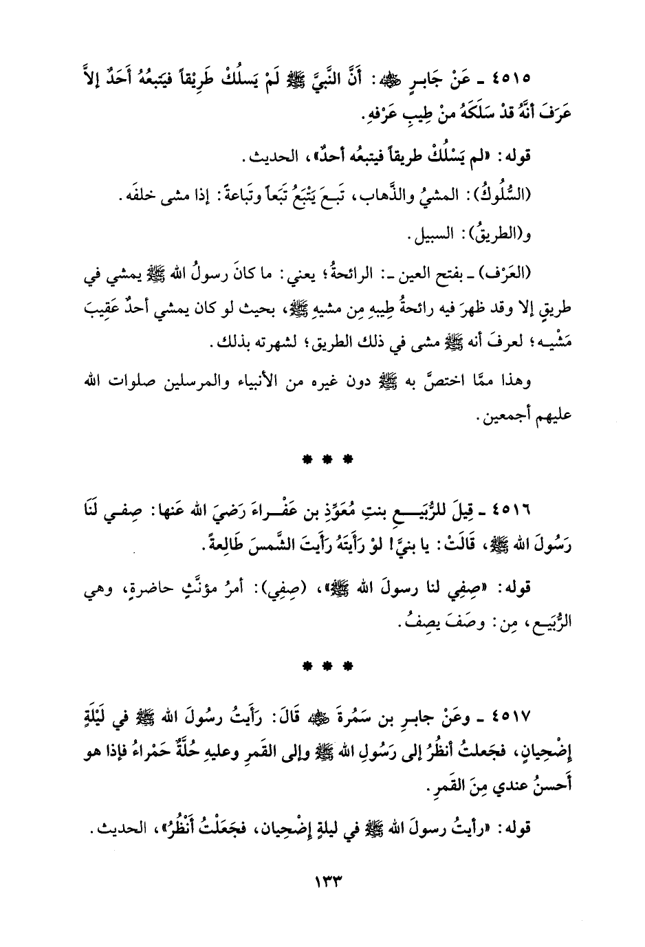 4515 - عَنْ جَابرٍ - رضي الله عنه -: أَنَّ النَّبيَّ - صلى الله عليه وسلم - لَم يَسلُكْ طَرِيقًا فيَتبعُهُ أَحَدٌ إلاَّ عَرَفَ أنَّهُ قدْ سَلَكَهُ منْ طِيبِ عَرْفهِ.