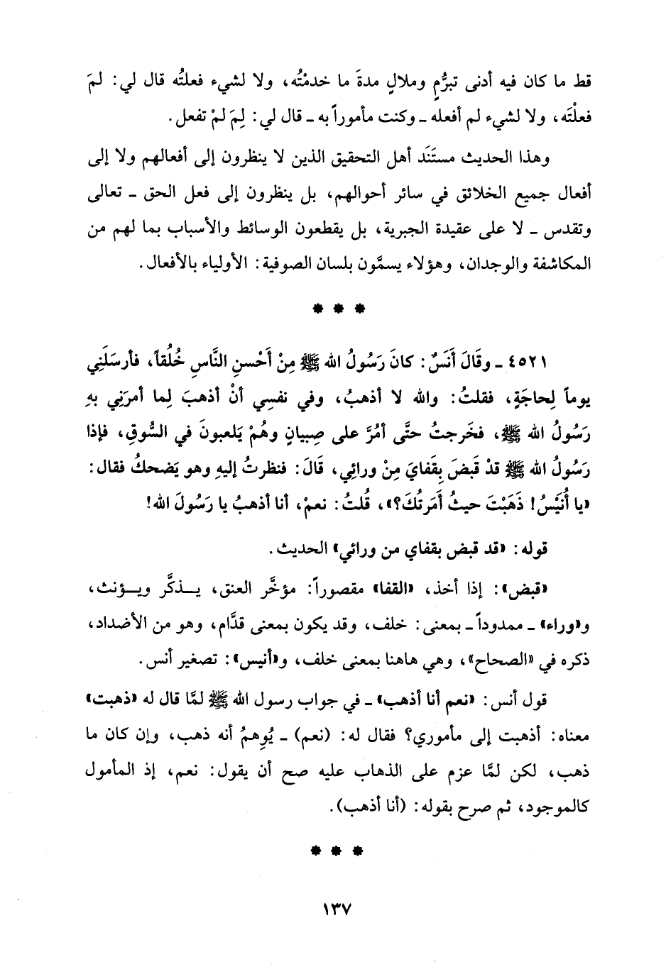 4521 - وقَالَ أَنسٌ: كانَ رَسُولُ الله - صلى الله عليه وسلم - مِنْ أَحْسنِ النَّاسِ خُلُقًا، فأرسَلَنِي يومًا لِحاجَةٍ، فقلتُ: والله لا أذهبُ، وفي نفسِي أنْ أذهبَ لِما أمرَنِي بهِ رَسُولُ الله - صلى الله عليه وسلم -، فخَرجتُ حتى أمُرَّ على صبيانٍ وهُمْ يَلعبونَ في السُّوقِ، فإذا رَسُولُ الله - صلى الله عليه وسلم - قدْ قَبضَ بِقَفايَ مِنْ ورائِي، قَالَ: فنظرتُ إليهِ وهو يَضحكُ فقال: "يا أُنَيْسُ! ذَهَبْتَ حيثُ أَمَرتُكَ؟ "، قُلتُ: نعمْ، أنا أذهبُ يا رَسُولَ الله!