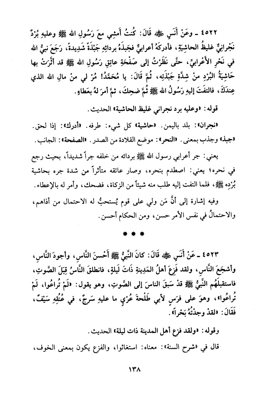 4522 - وعَنْ أَنَسٍ - رضي الله عنه - قَالَ: كُنتُ أَمشِي معَ رَسُولِ الله - صلى الله عليه وسلم - وعليهِ بُرْدٌ نَجْرانِيٌّ غليظُ الحاشِيَةِ، فأدركَهُ أعرابيٌّ فجَبذَهُ بردائِهِ جَبْذَةً شَدِيدةً، رَجَعَ نبيُّ الله في نَحْرِ الأَعْرابيِّ، حتَّى نَظَرْتُ إلى صَفْحَةِ عاتِقِ رَسُولِ الله - صلى الله عليه وسلم - قد أثَّرَتْ بها حَاشِيَةُ البُرْدِ منْ شِدَّةِ جَبْذَتِه، ثُمَّ قَالَ: يا مُحَمَّدُ! مُرْ لي منْ مالِ الله الذي عِندَكَ، فالتفَتَ إليهِ رَسُولُ الله - صلى الله عليه وسلم - ثُمَّ ضحِكَ، ثمَّ أمرَ لهُ بعَطاءٍ.