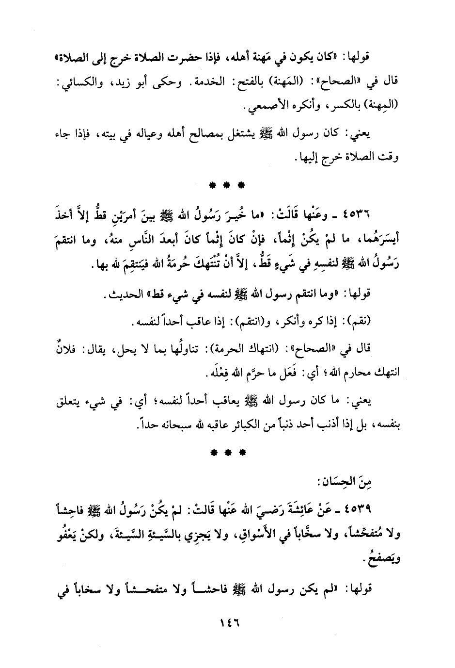 4536 - وعَنْها قَالَتْ: "ما خُيرَ رَسُولُ الله - صلى الله عليه وسلم - بينَ أمرَيْنِ قطُّ إلَّا أخذَ أيسَرَهُما, ما لمْ يكُنْ إِثْمًا، فإنْ كانَ إِثْمًا كانَ أبعدَ النَّاسِ منهُ، وما انتقمَ رَسُولُ الله - صلى الله عليه وسلم - لنفسِهِ في شَيءٍ قَطُّ، إلَّا أنْ تُنْتَهكَ حُرمَةُ الله فيَنتقِمَ لله بها.
